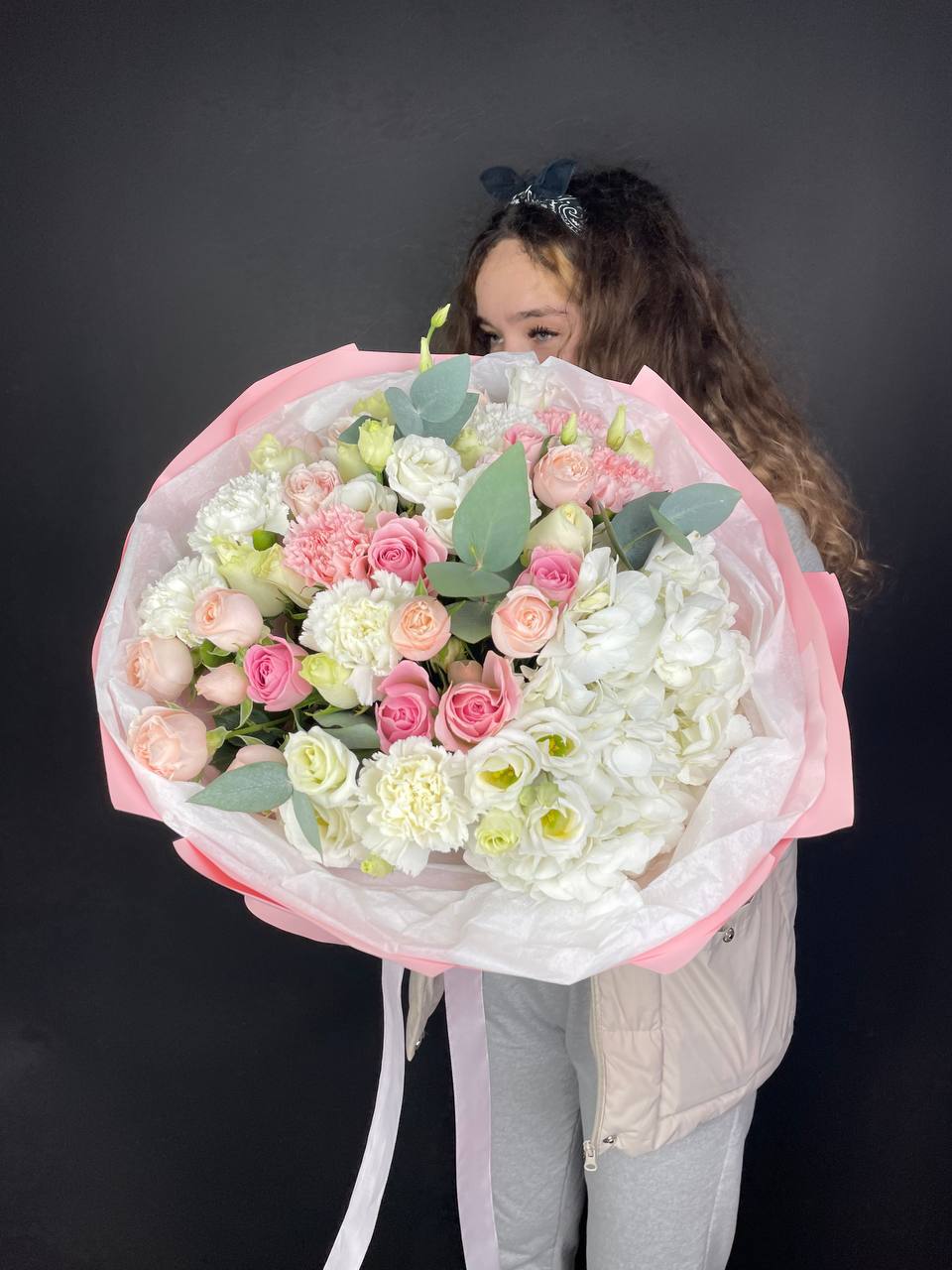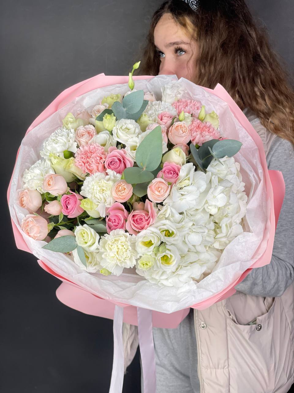 пионовидная кустовая кустовая роза Мисти Баблс, статица, лента, дизайнерская упаковка.