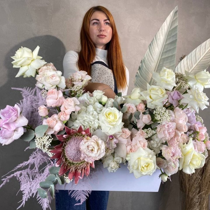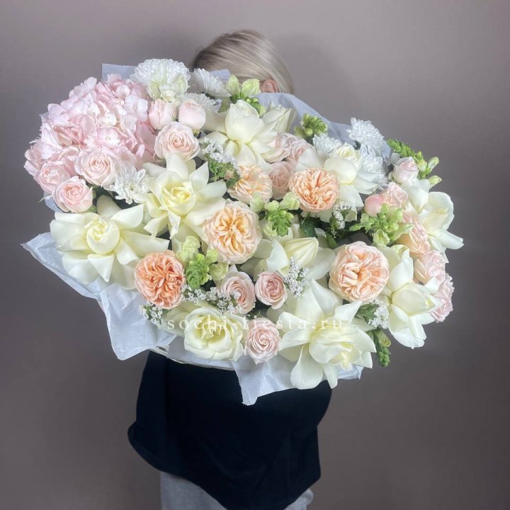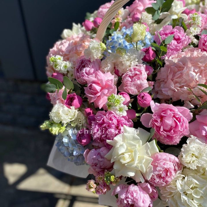 Цветочная корзина из пионов и пионовидных роз "Perfezione"