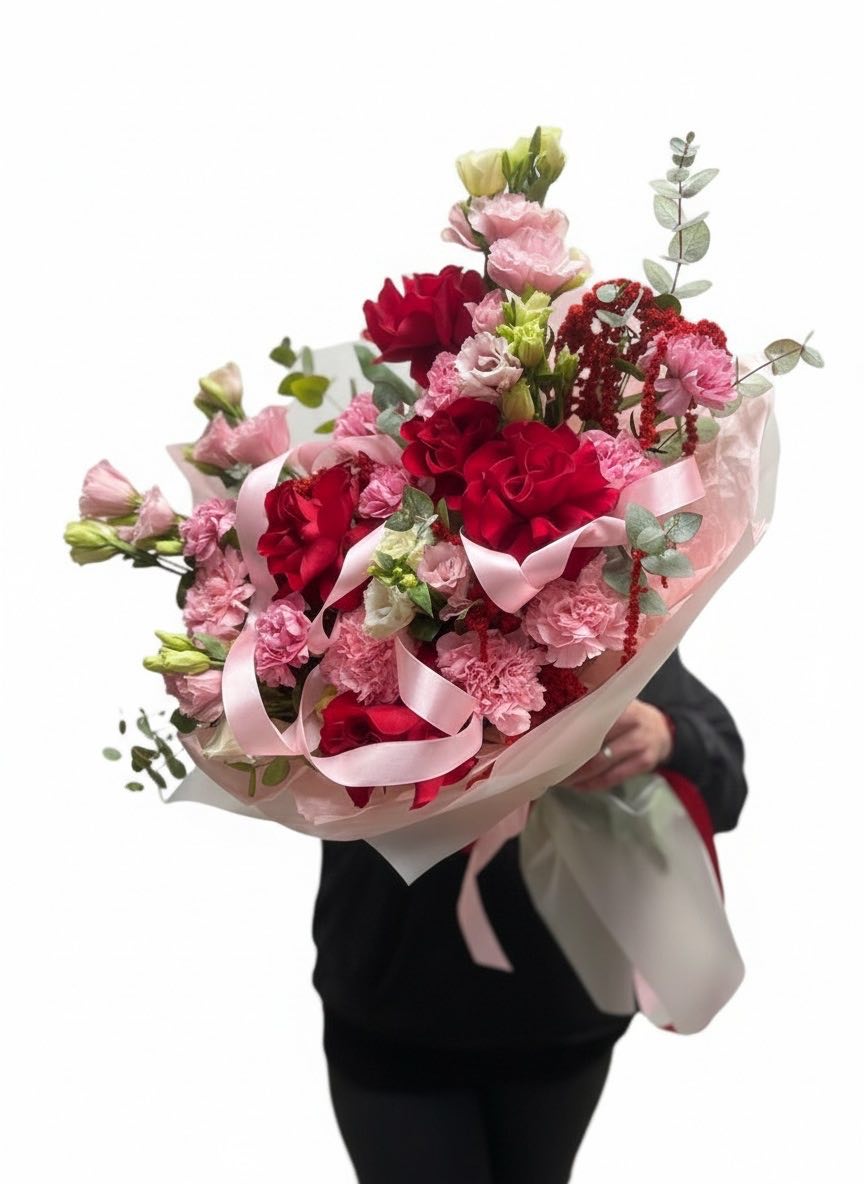 Этот пышный авторский букет в красно-розовых тонах представляет собой гармоничное сочетание страсти и нежности.