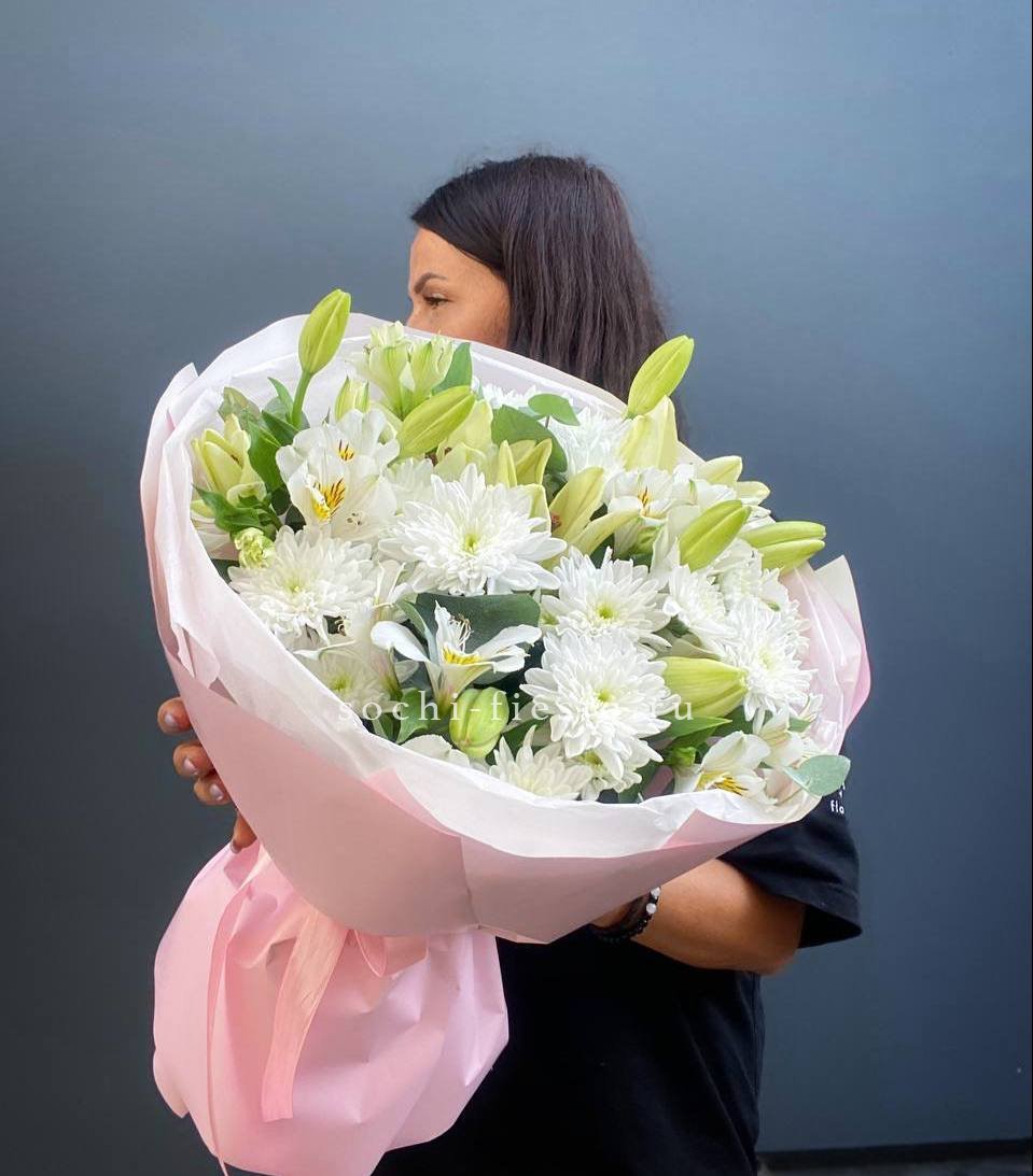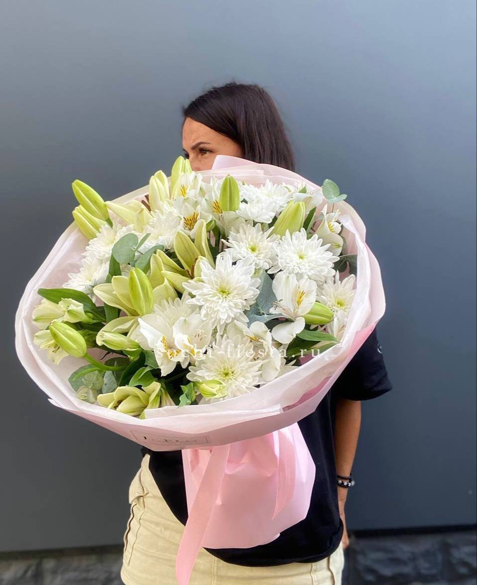 Состав: гортензия, эустома, кустовая роза, диантуслента, упаковка