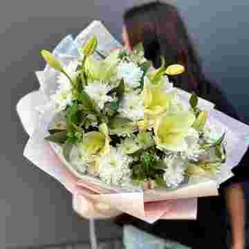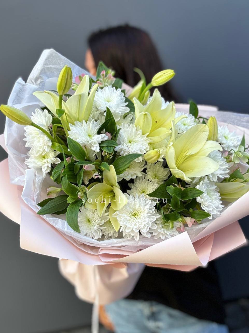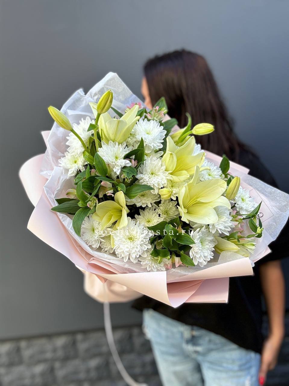 Состав: хризантема, лилия, альстромерия (возможна замена от сезона), упаковка