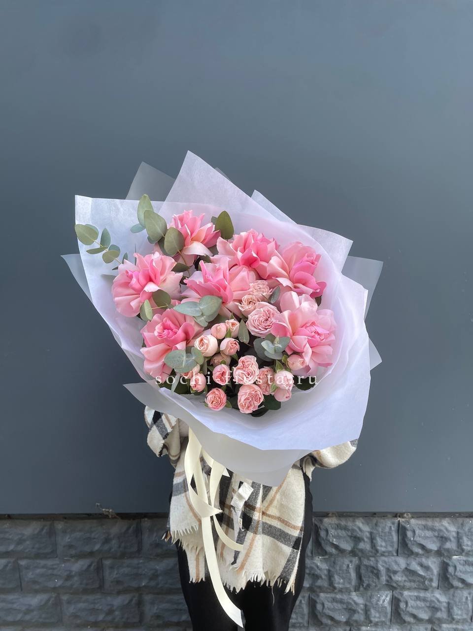 Состав: Розовые розы, пионовидная кустовая роза, эвкалипт,  лента, авторская упаковка