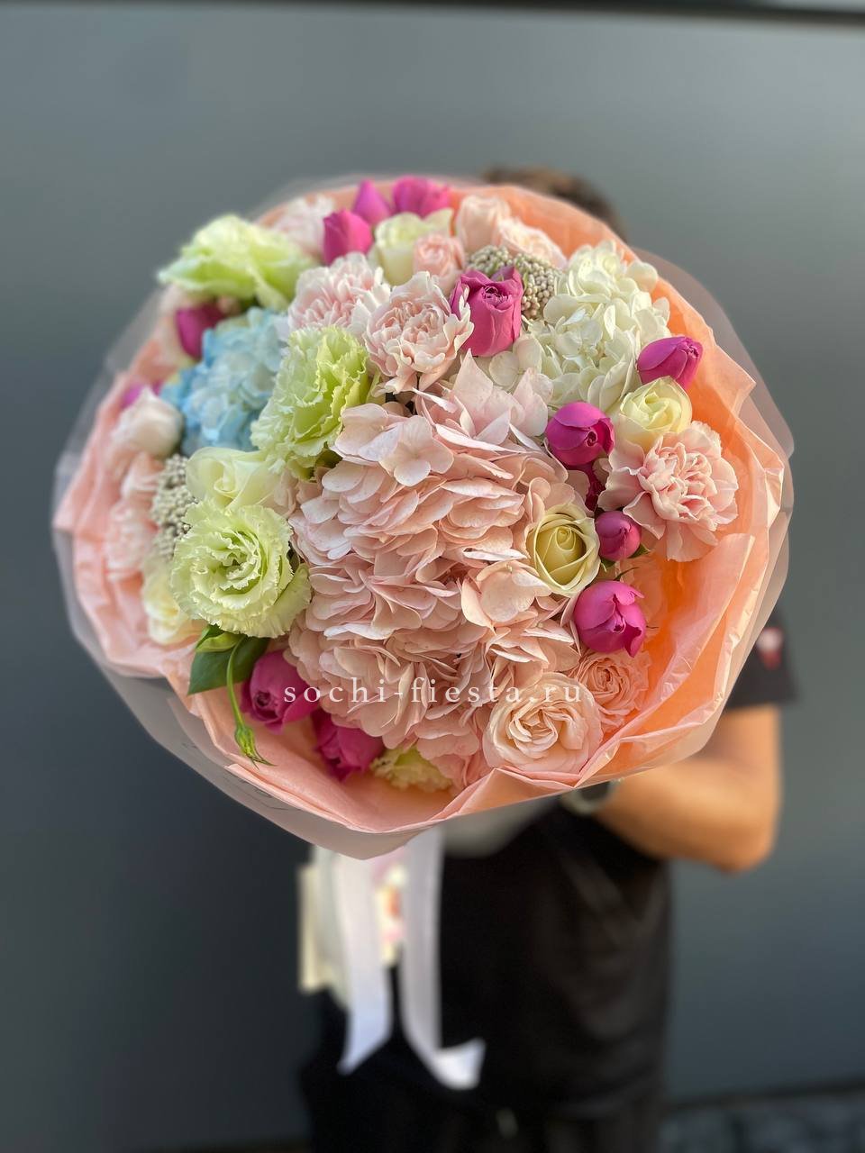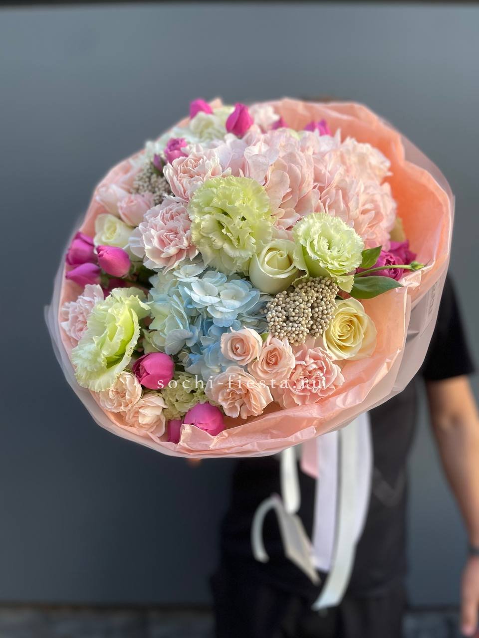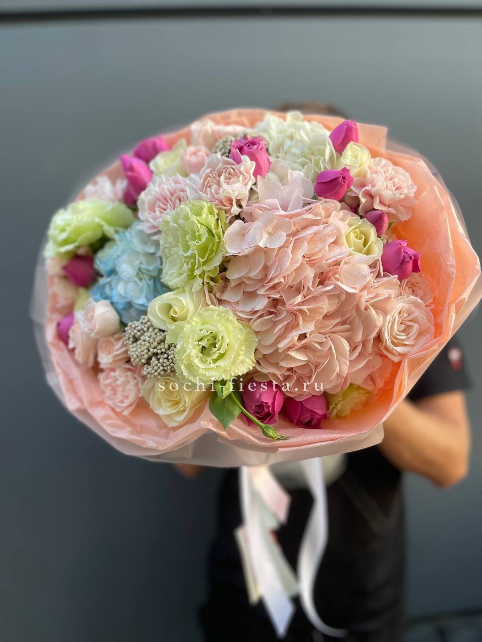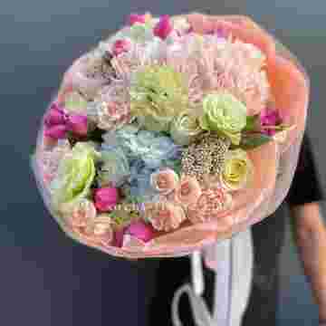 Состав: гортензия, эустома, диантус, озатамус, мисти баблс, бомбастик, упаковка.