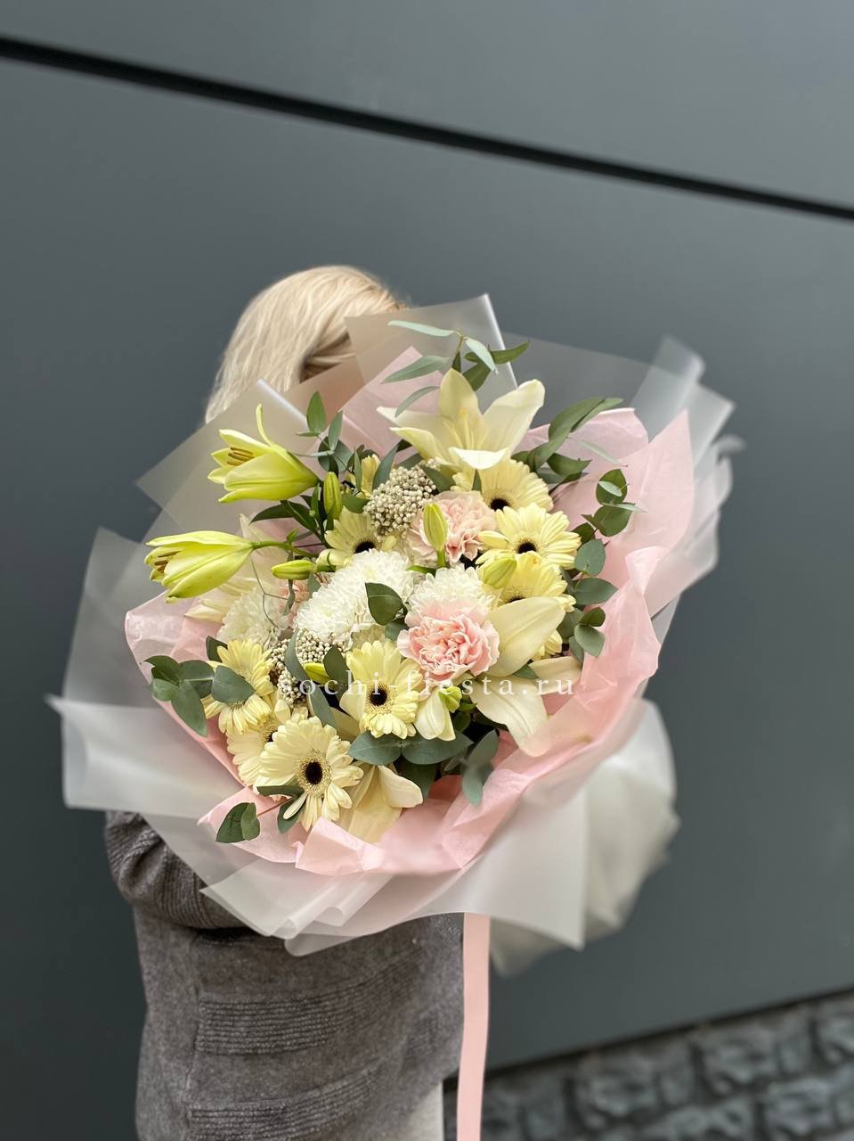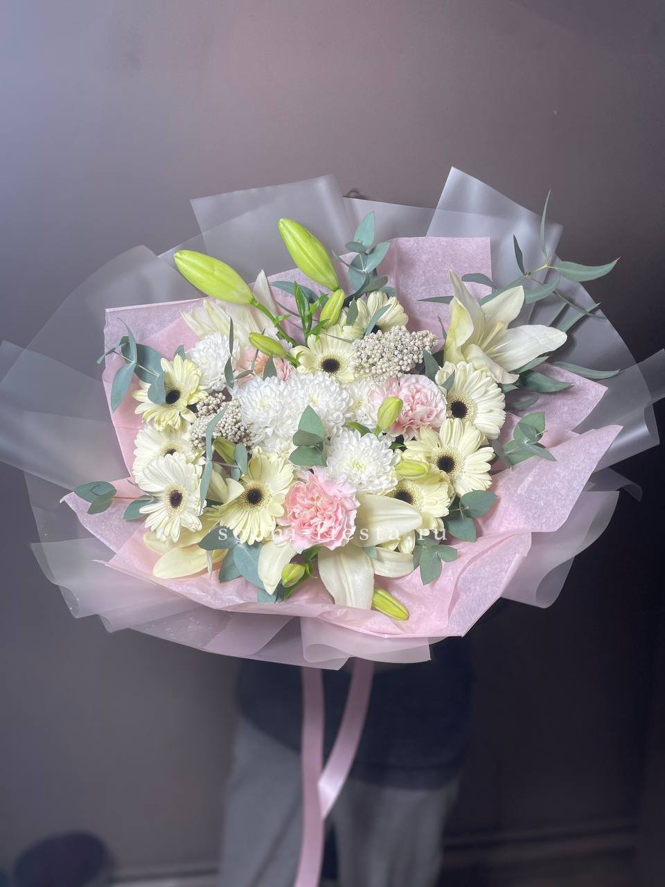 Состав: хризантемы, герберы, диантус, озатамус, лилии в оформлении