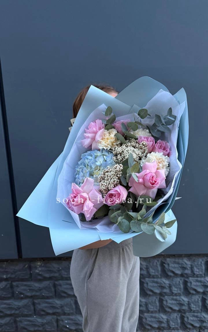 Состав: гортензия, розы, озотамус, диантусы, эвкалипт в оформлении