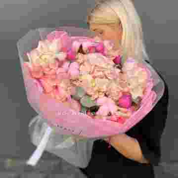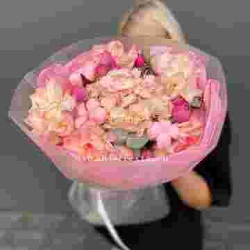 Состав: гортензия, роза, кустовая роза, диантус, эустома, дельфиниум, эвкалипт, лента, авторская упаковка