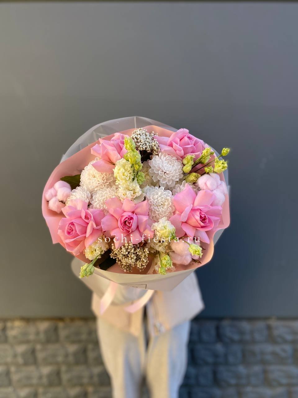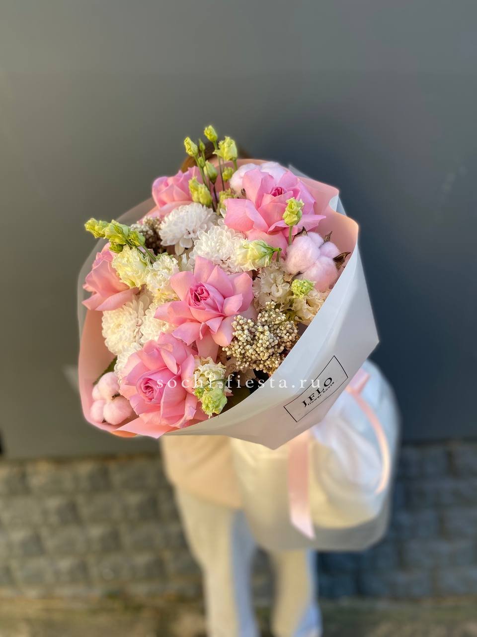 Состав: хризантема, эустома, озотамус, розы, хлопок в оформлении