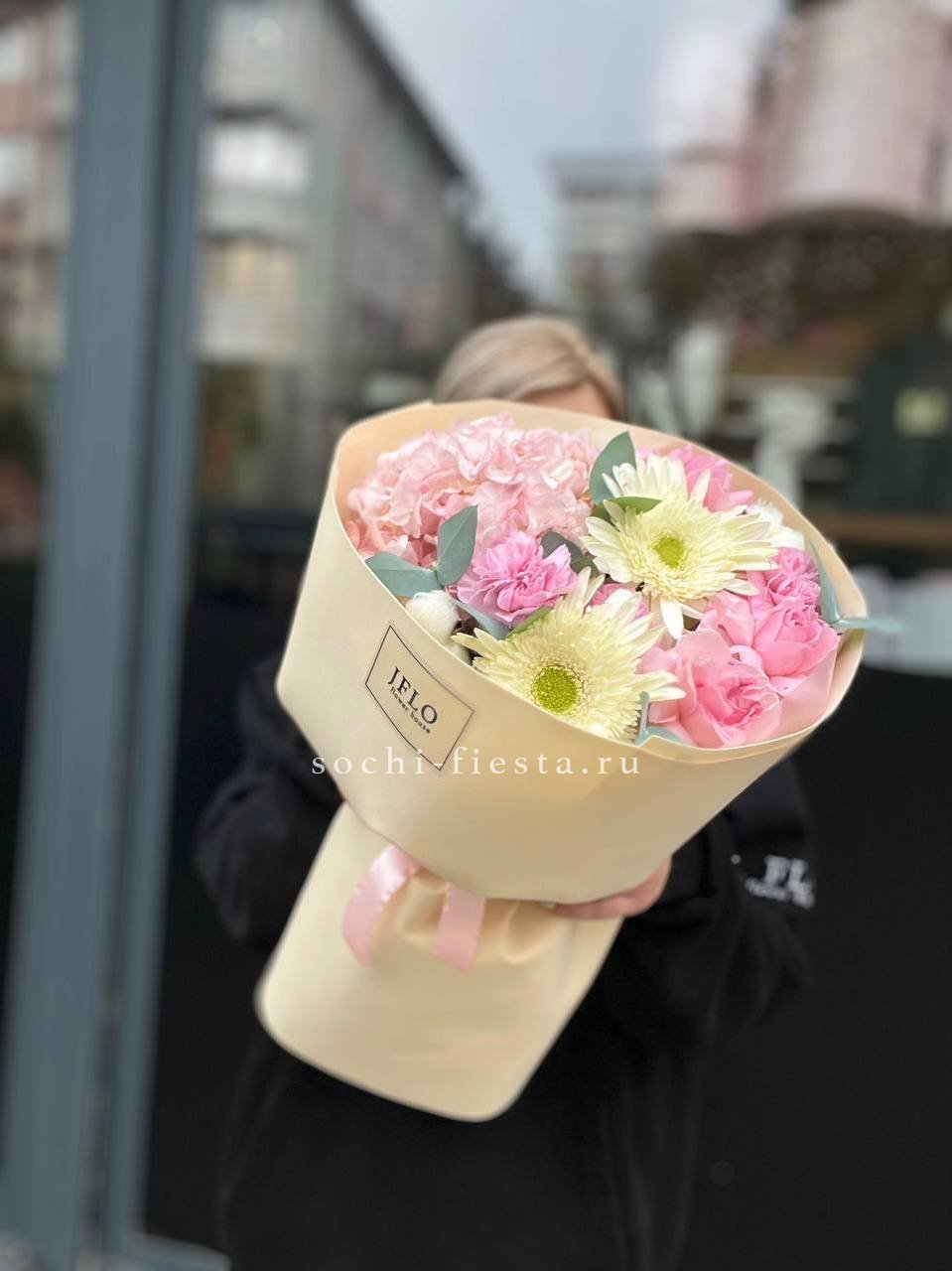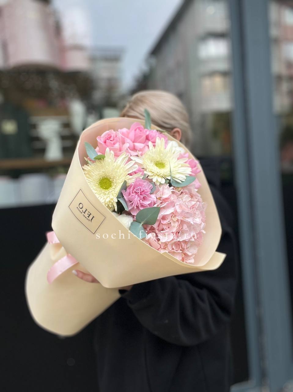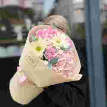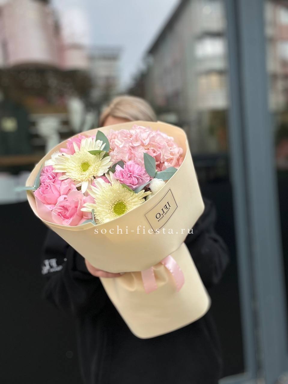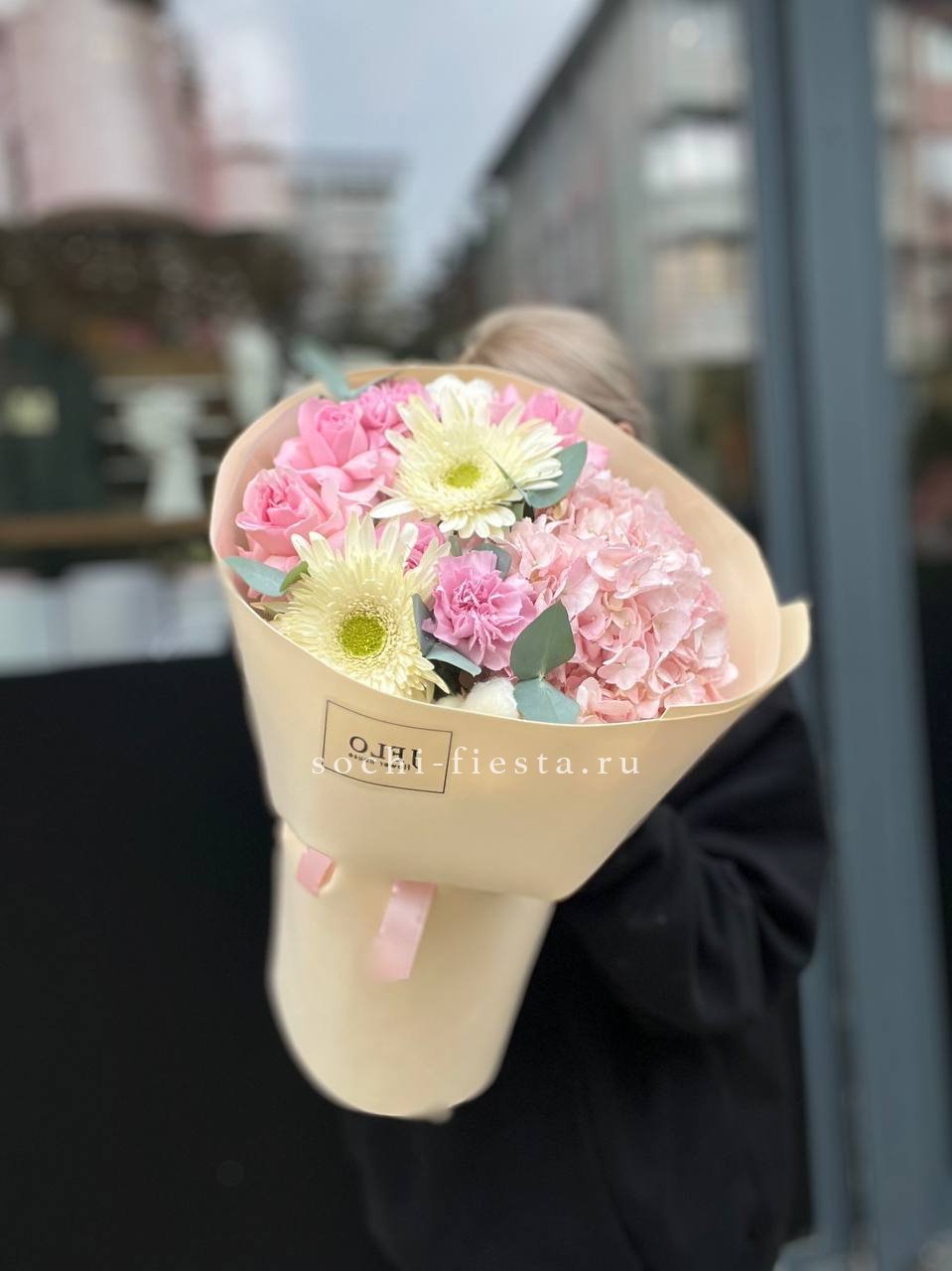 Состав: гербера, роза, хлопок, гортензия, диантус, эвкалипт, упаковка