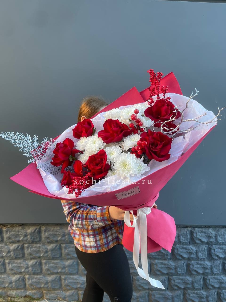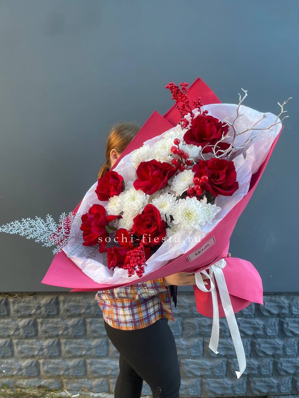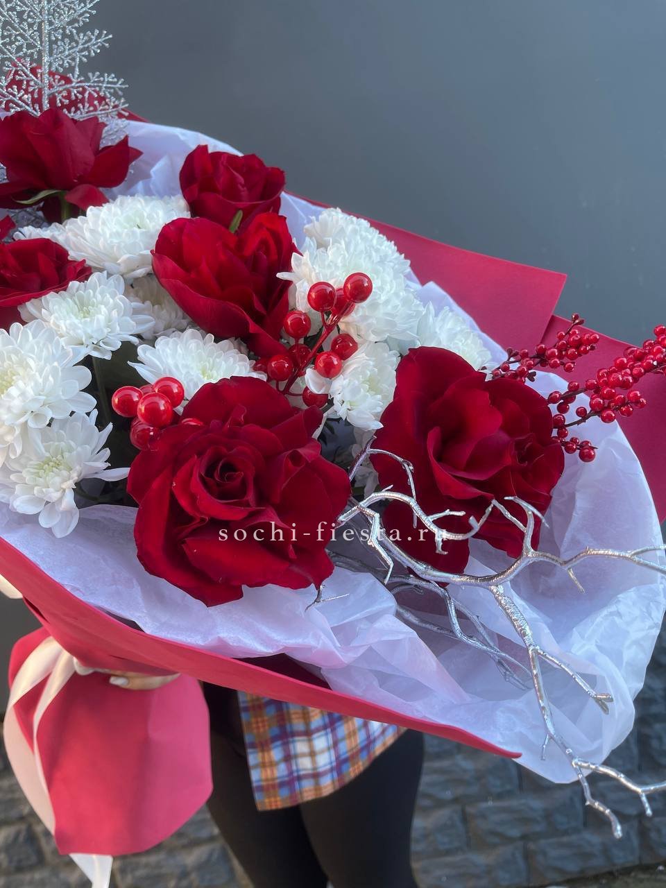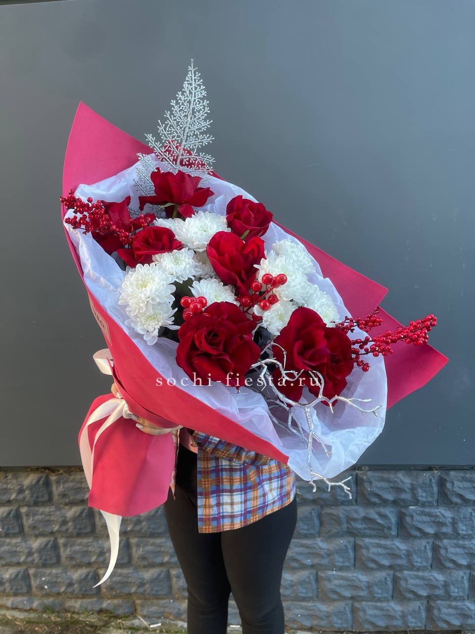 Яркий букет с элементами нового года. Стойкий, объёмный, зимний-это ваш выбор!