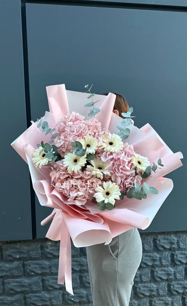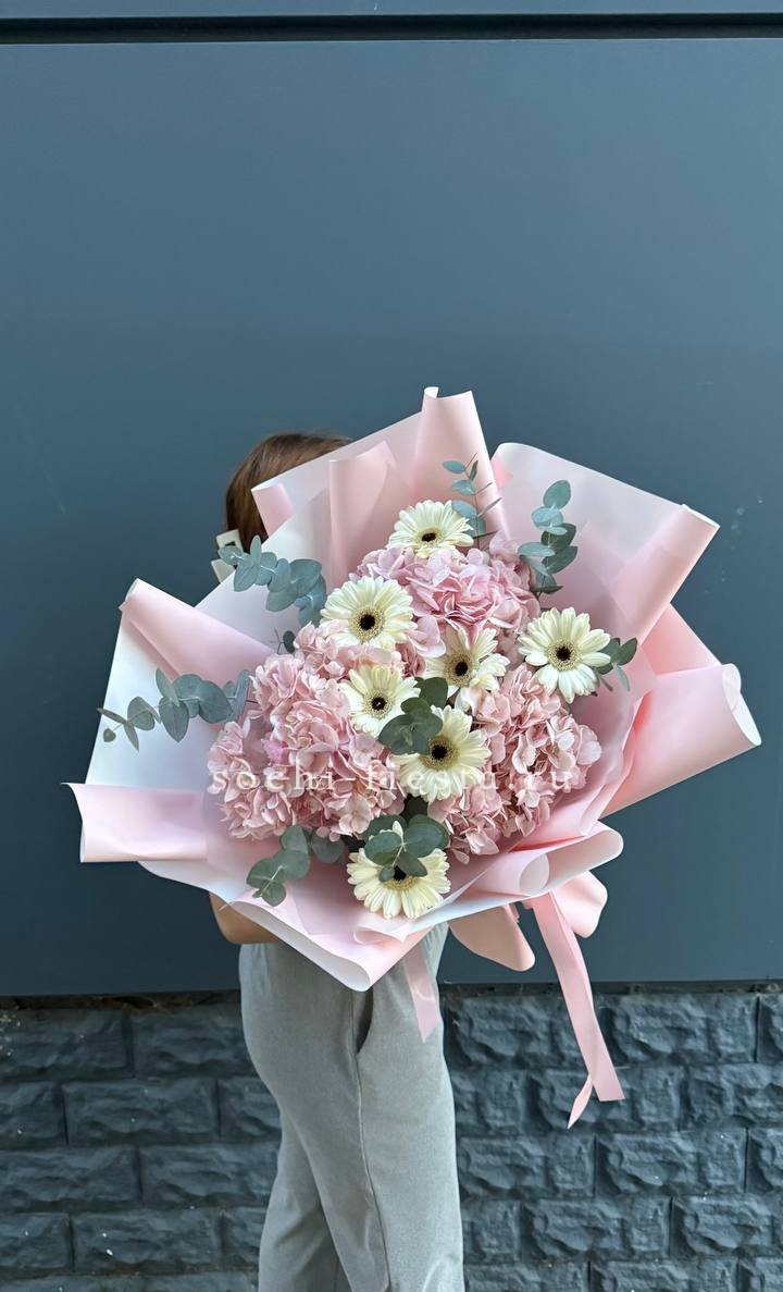 Состав: гортензия, гербера, эвкалипт в нежном оформлении