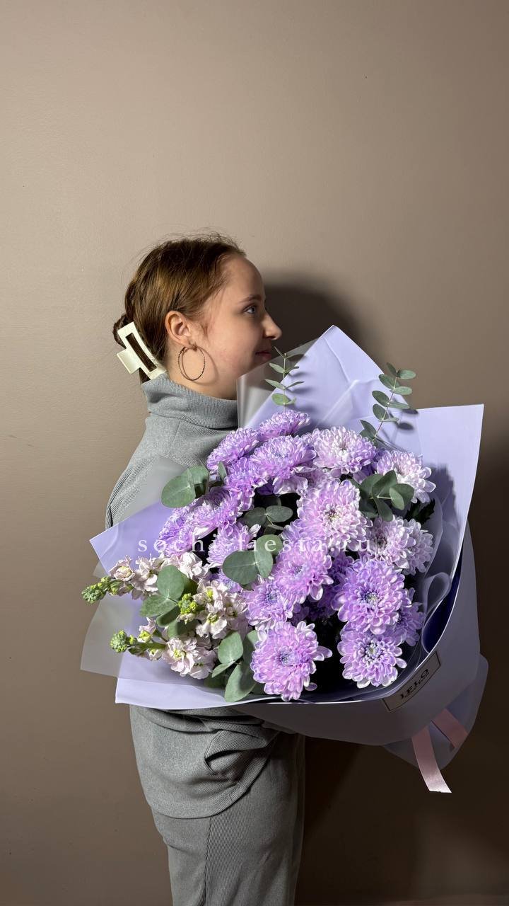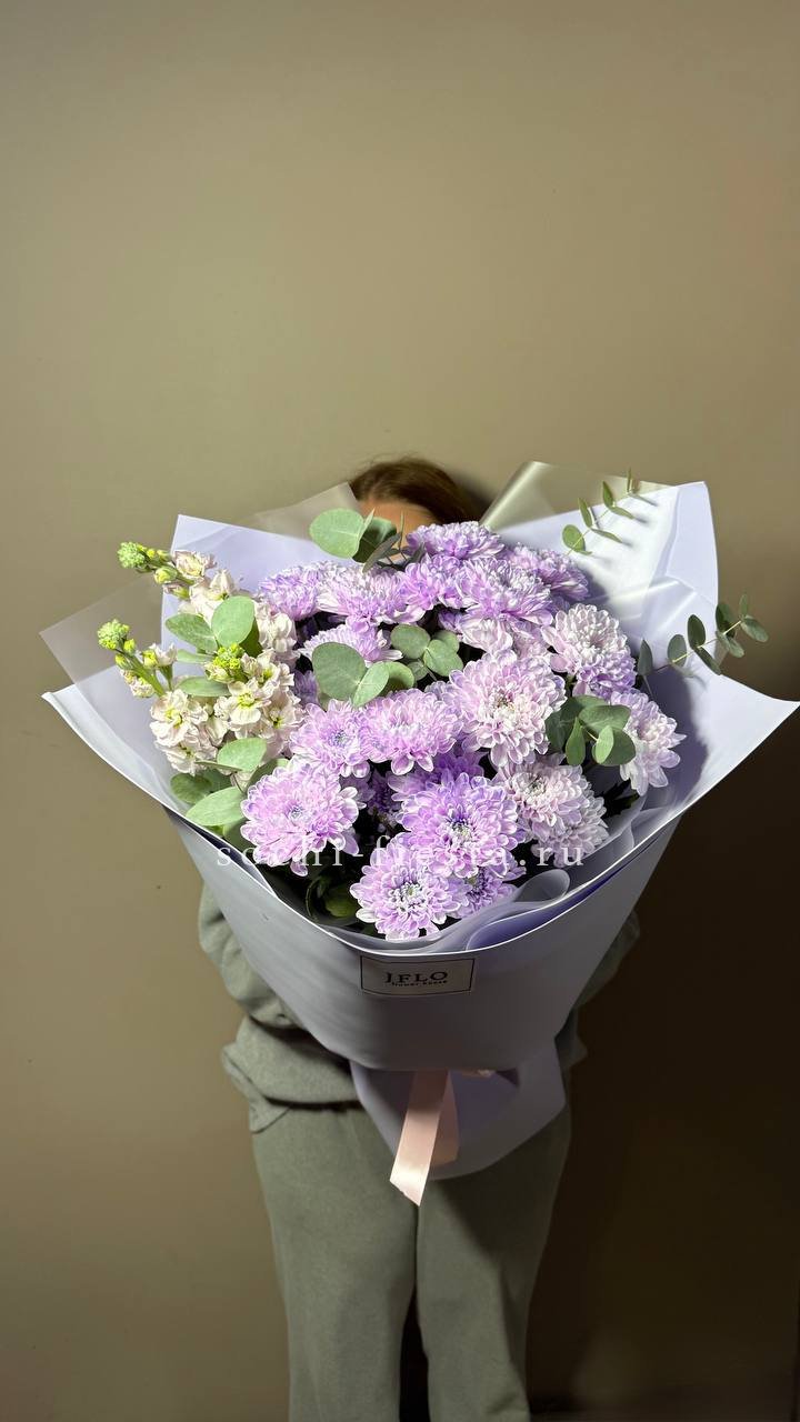 Состав: хризантема кустовая, маттиола, эвкалипт, оформление