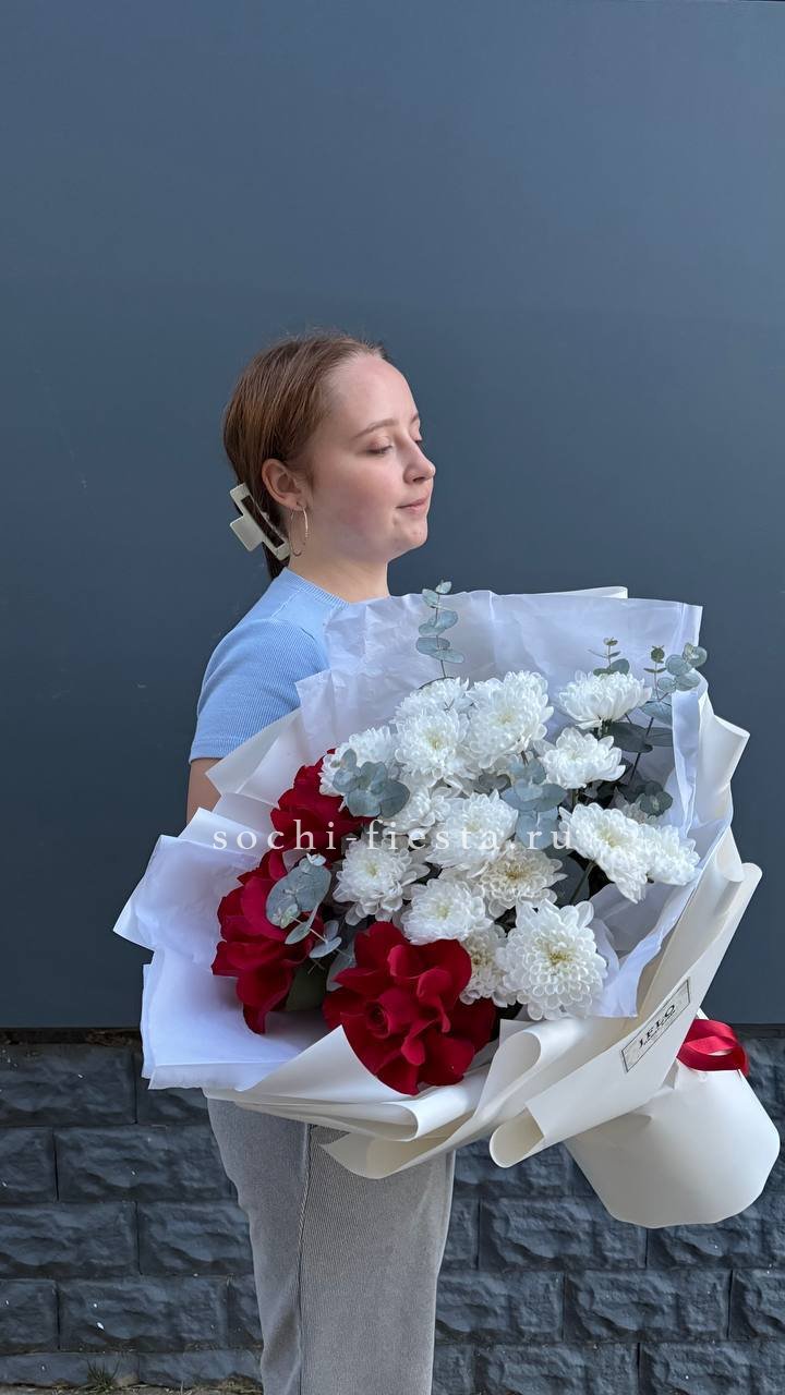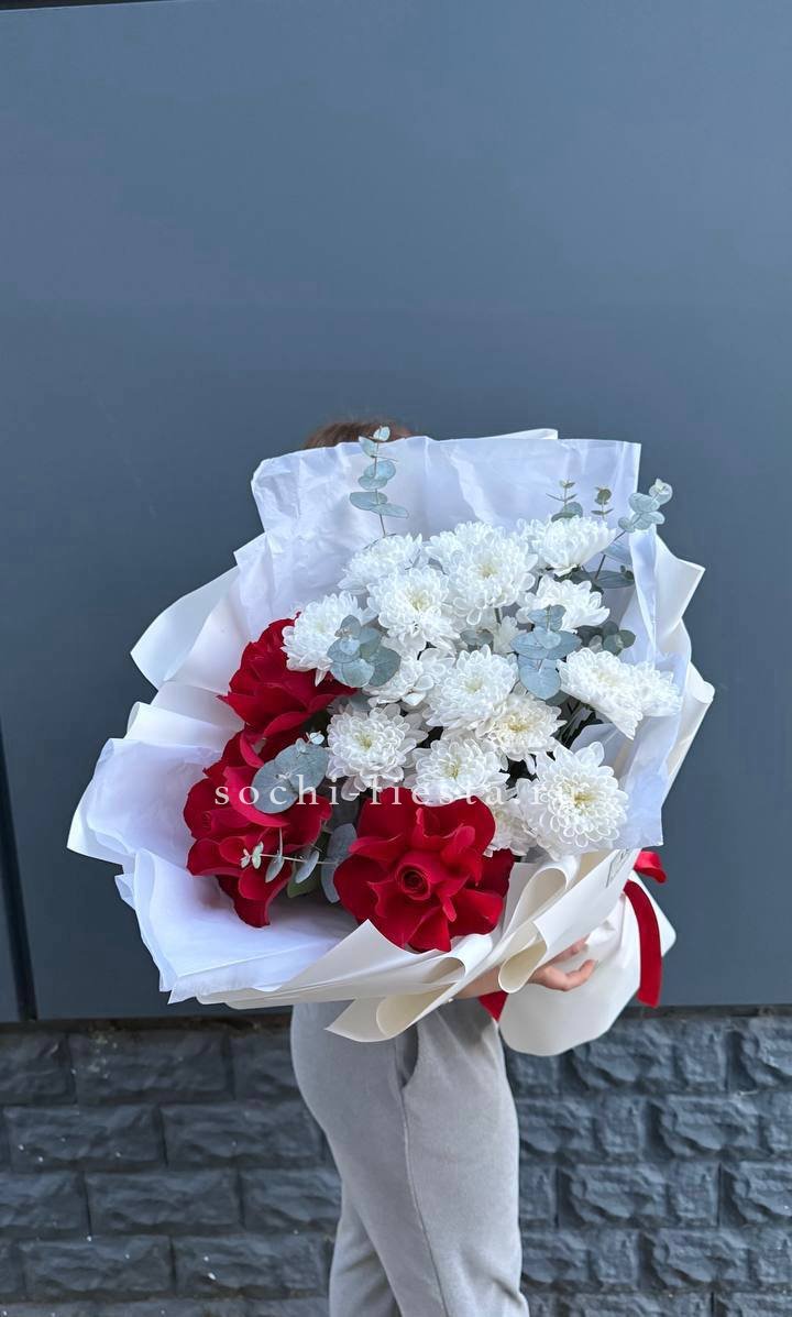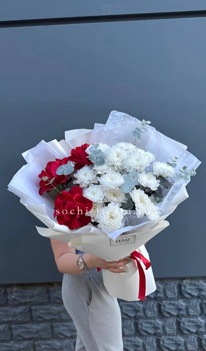 Состав: хризантема кустовая, красные розы с эвкалиптом в воздушном оформлении