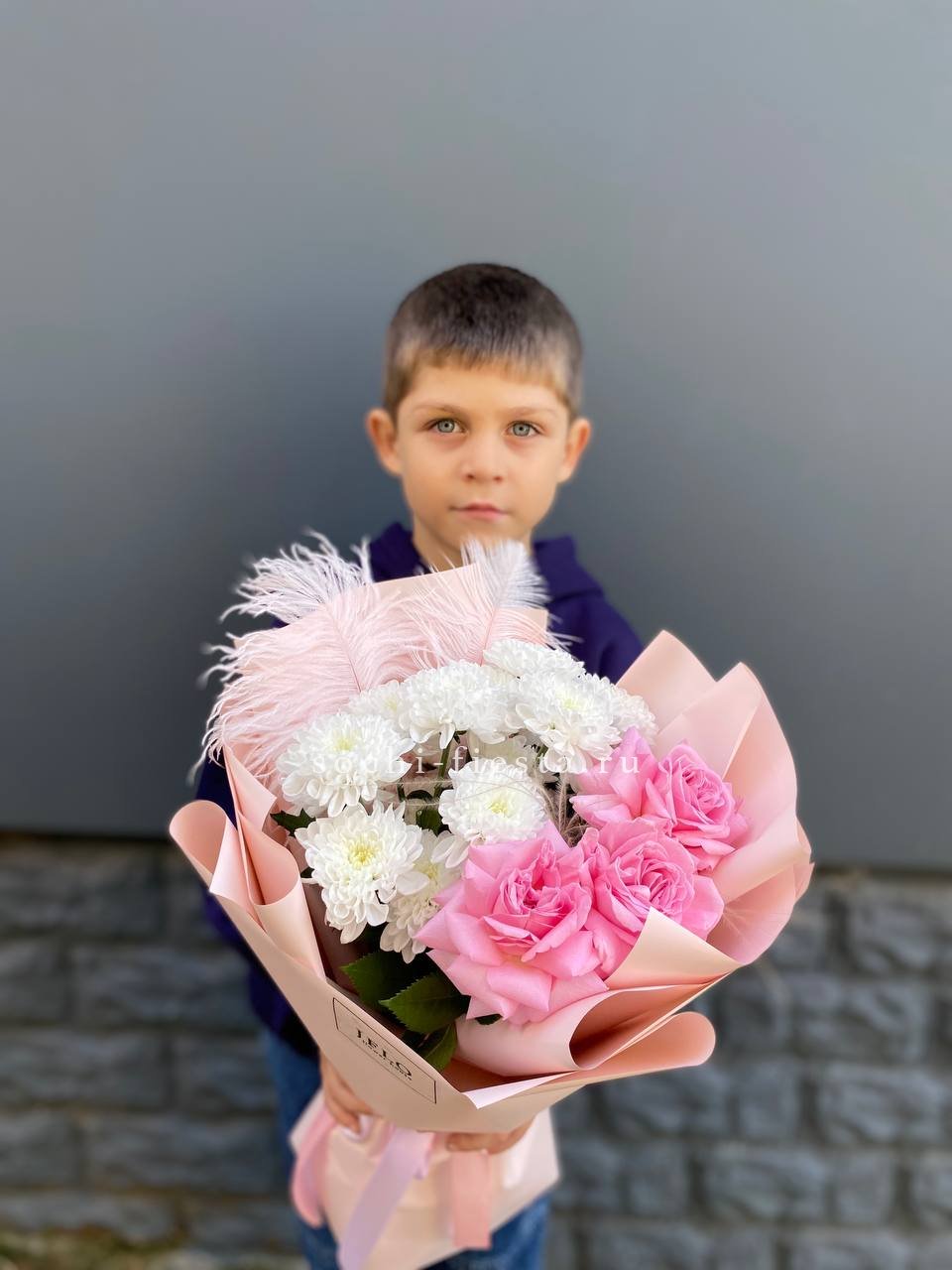 Состав: хризантема кустовая, розовые розы, перо, ковыль в оформлении