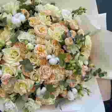 Состав: эустома, пионовидная кустовая роза, белая роза, хлопок, эвкалипт, оформление.