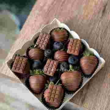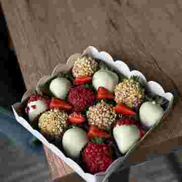 Состав: белый шоколад, клубника сублимированная, миндаль, фисташка