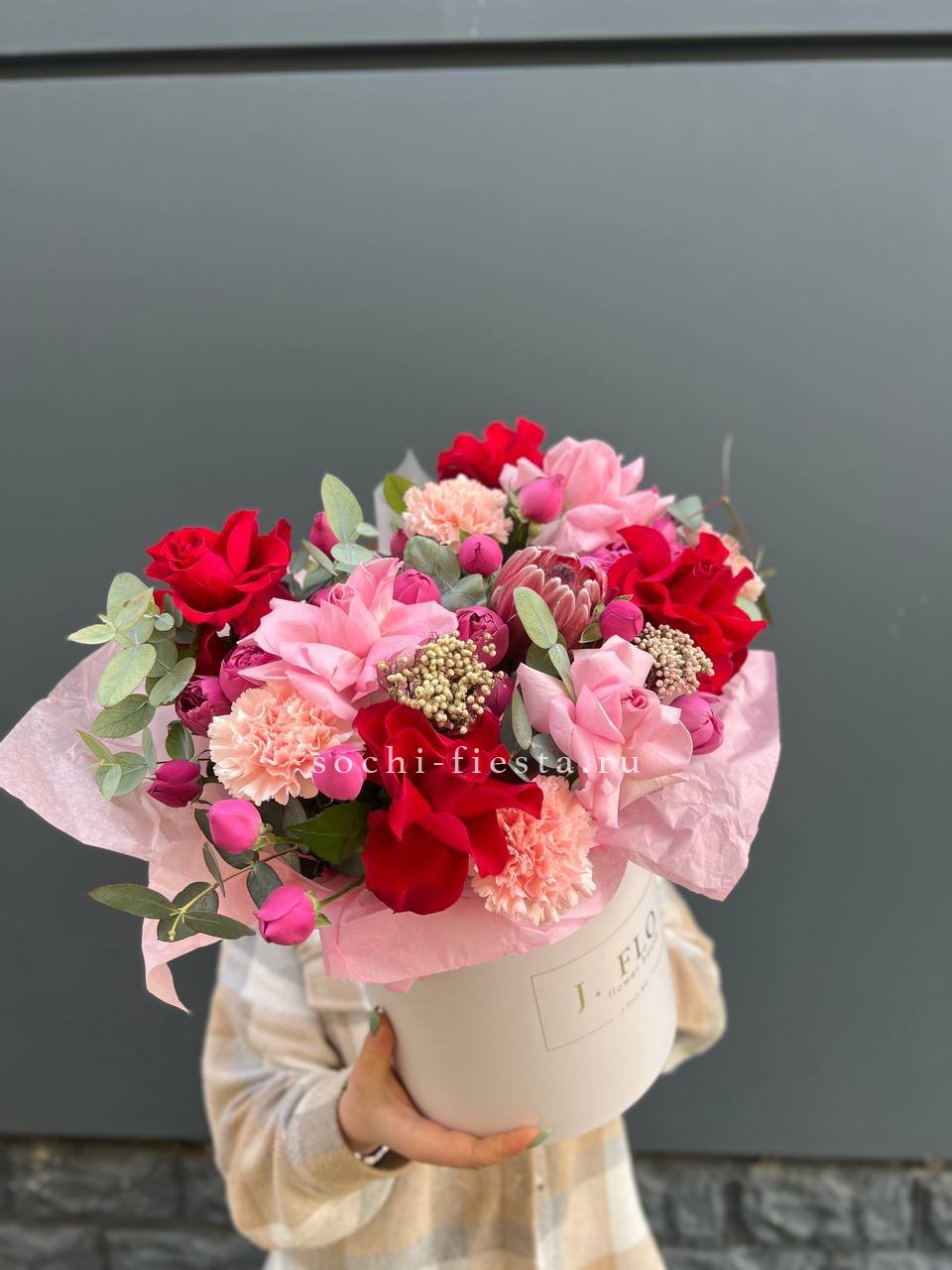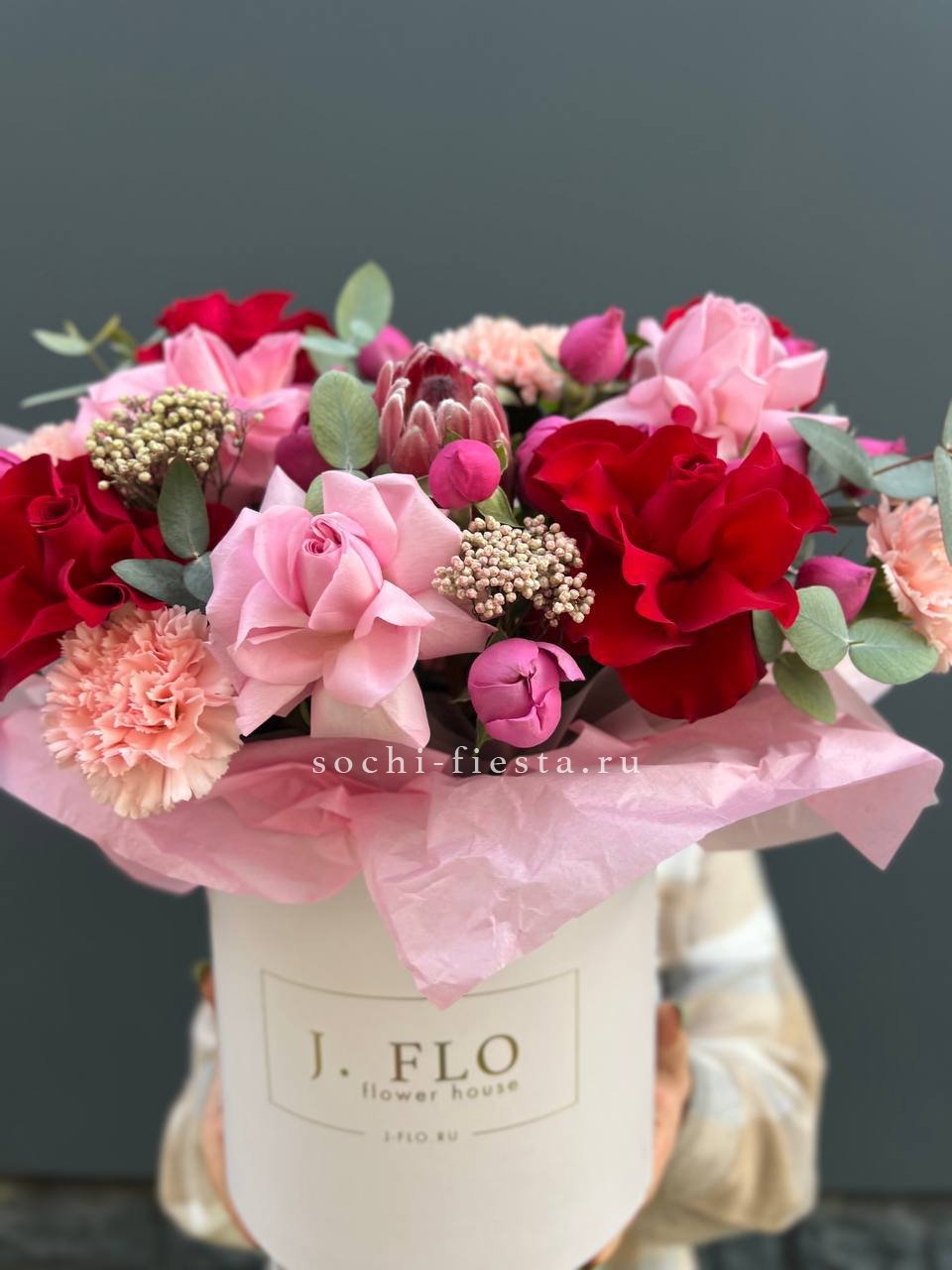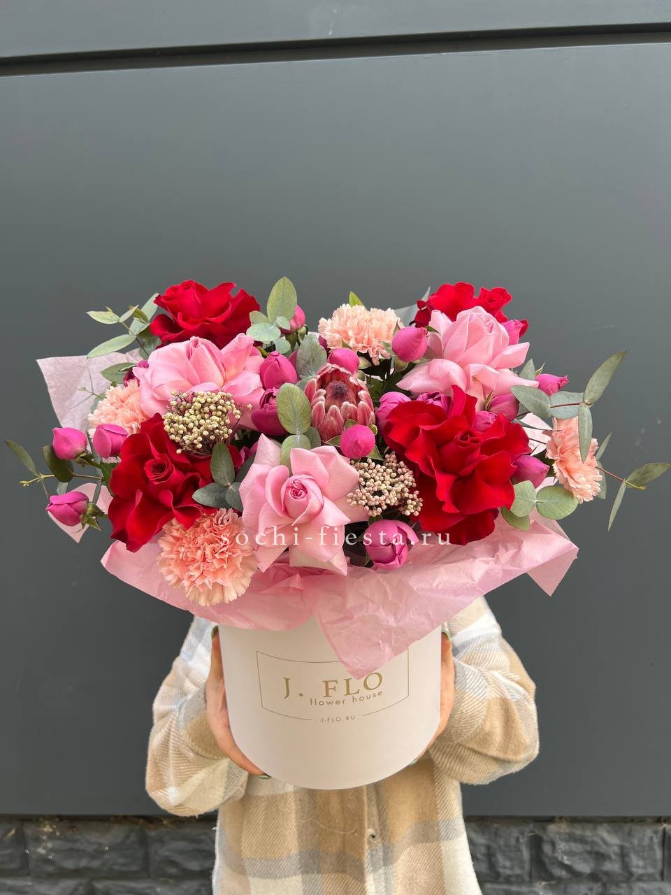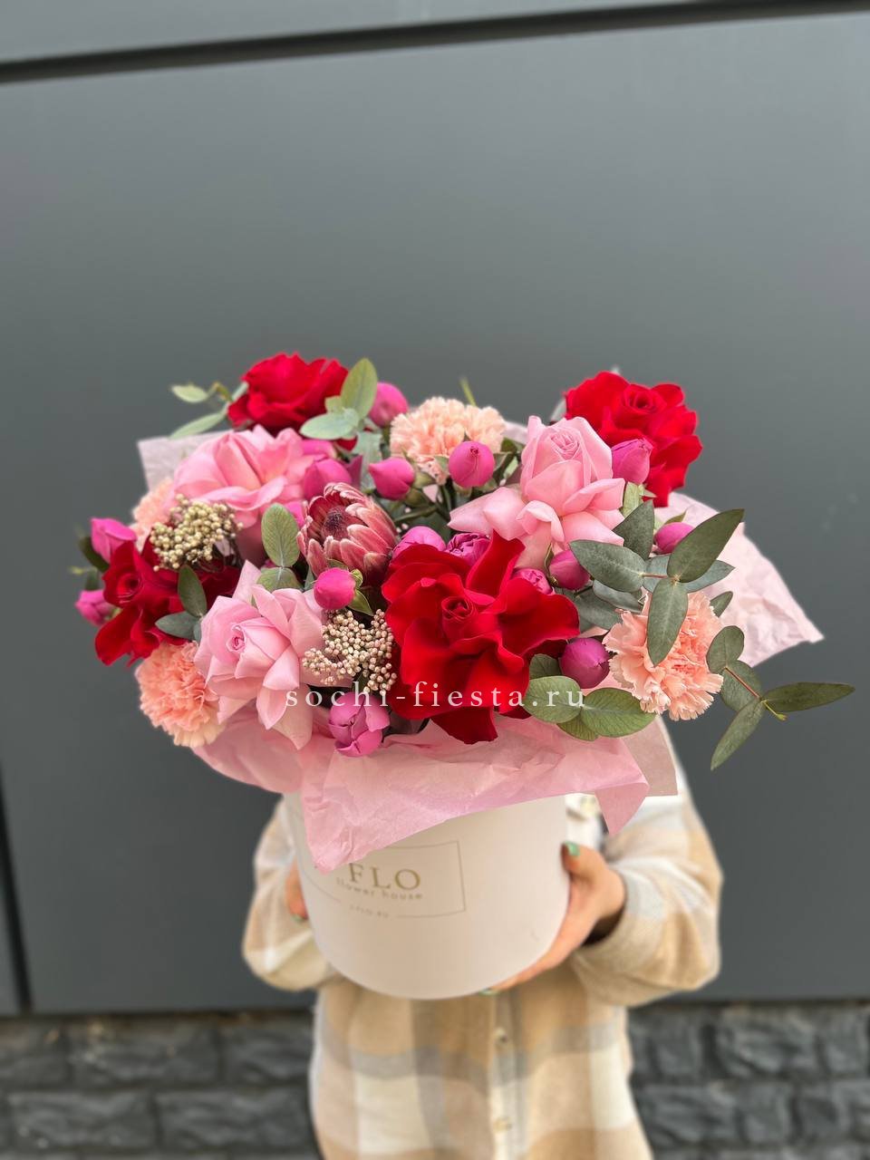 Состав: композиция из роз, протеи, диантусов, мисти баблс, озотамуса с эвкалиптом