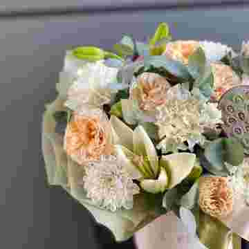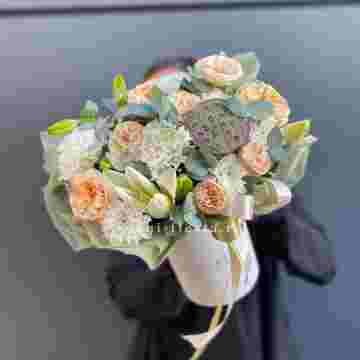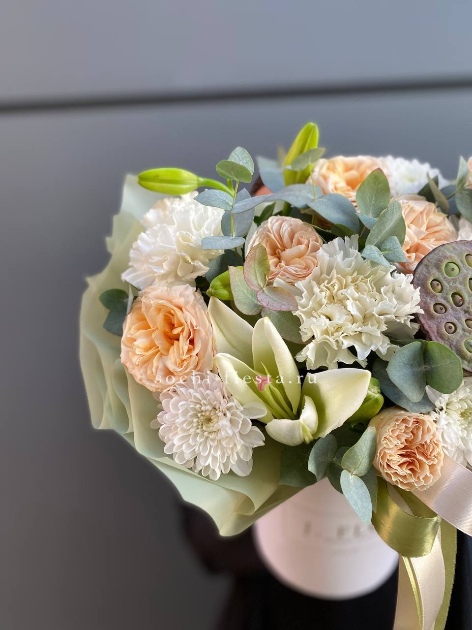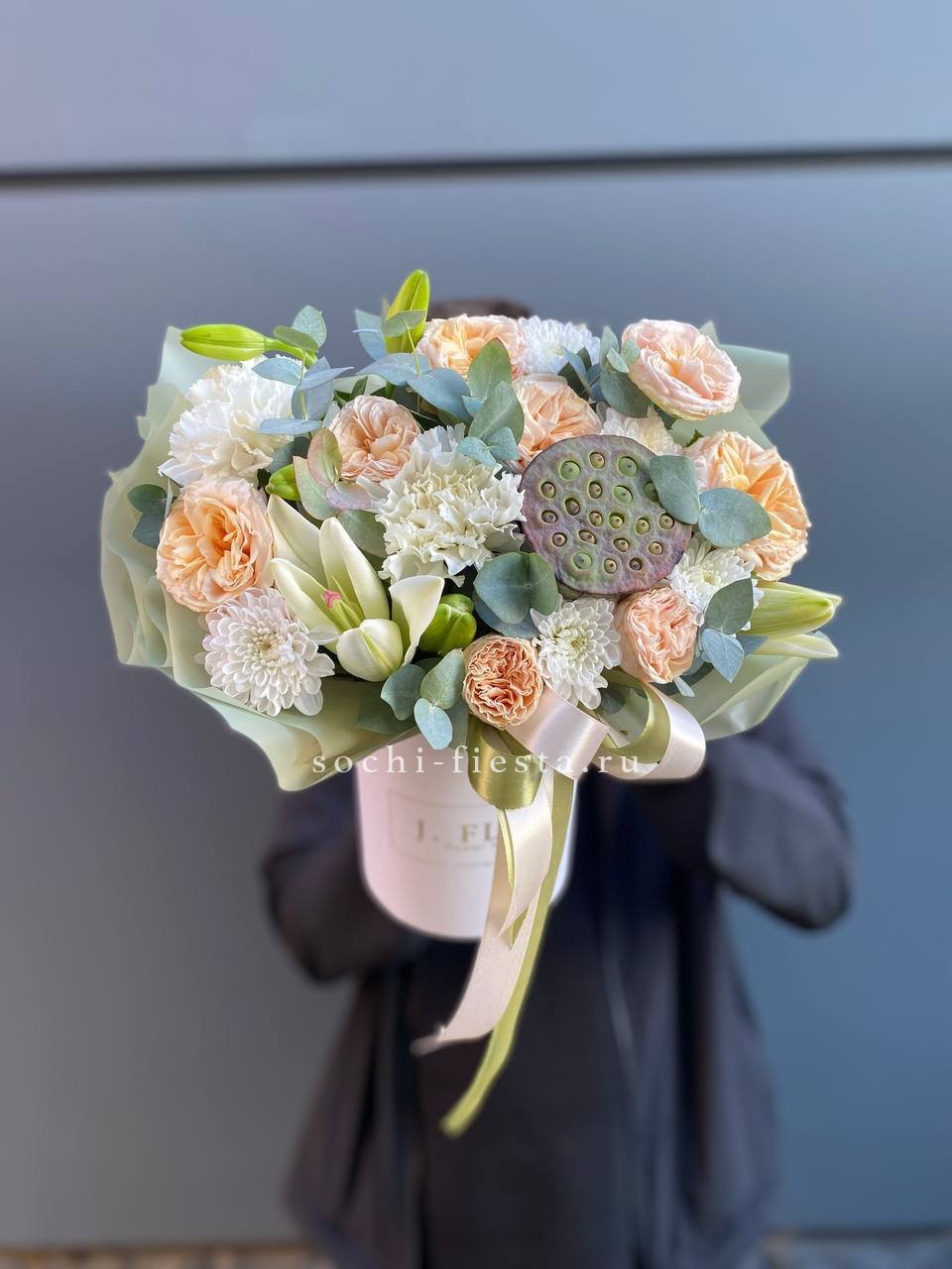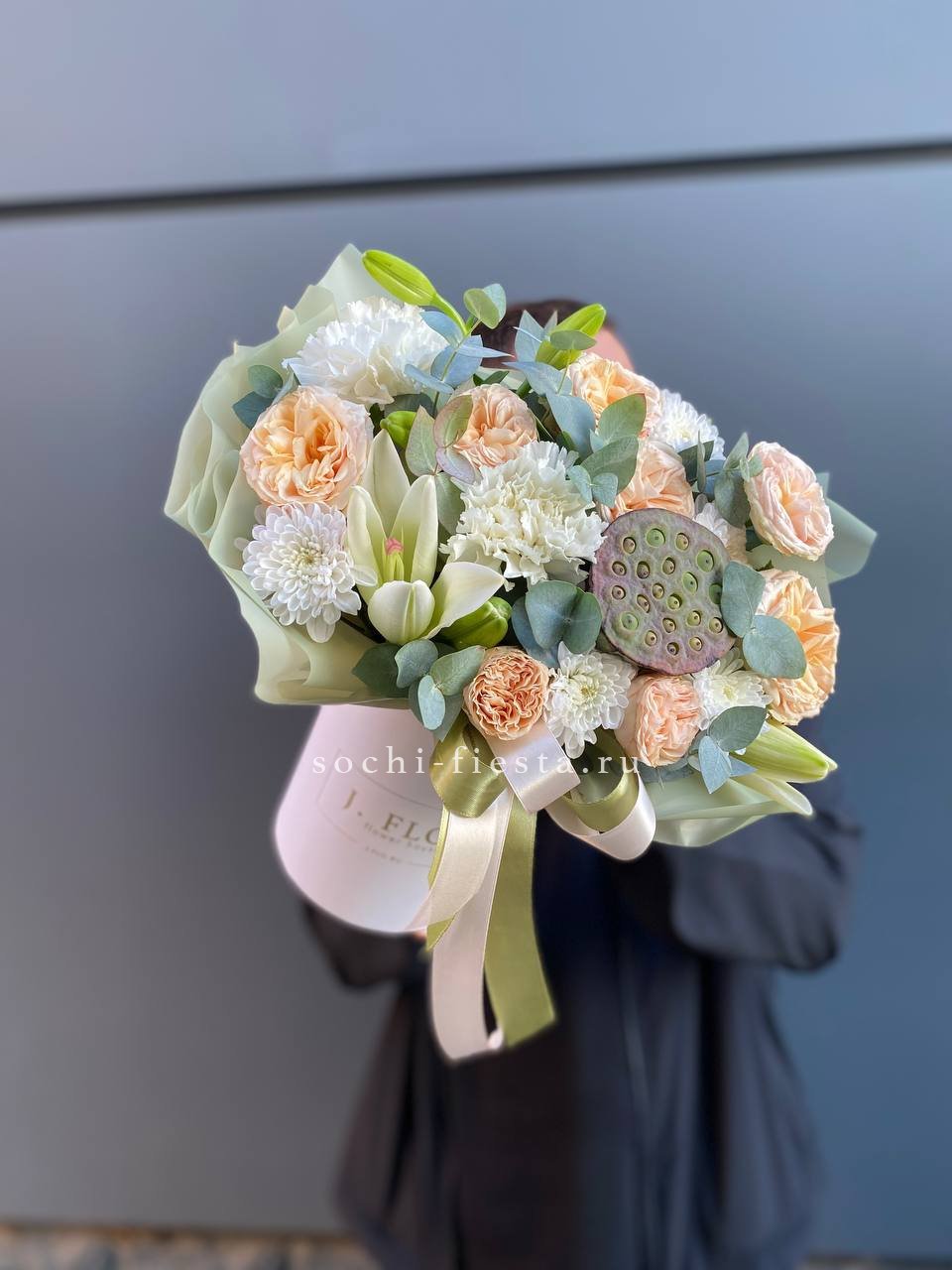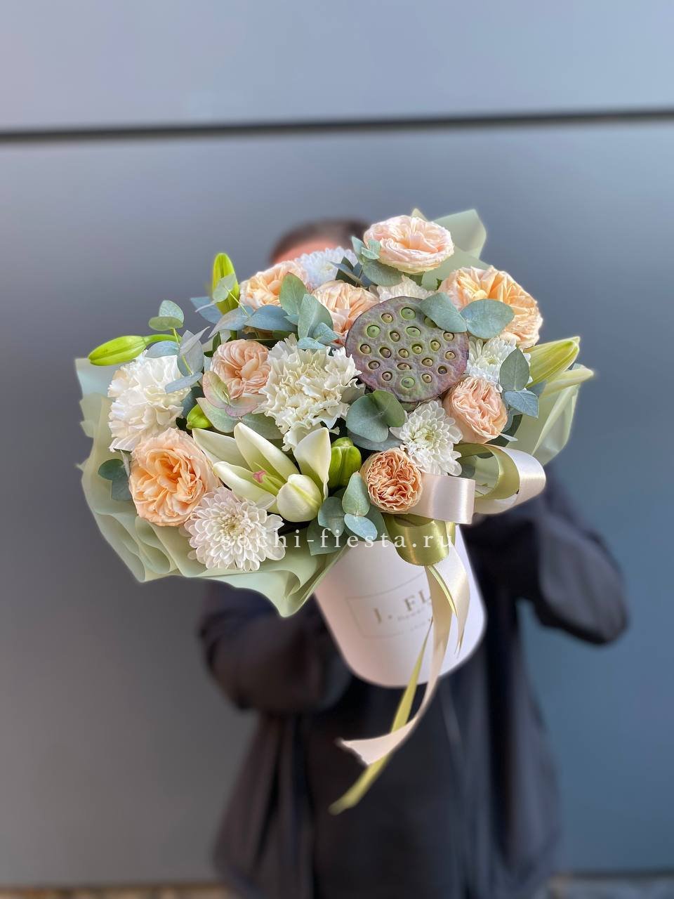 Состав: кустовая роза, лилия, диантус, лотос, эвкалипт, бокс 13