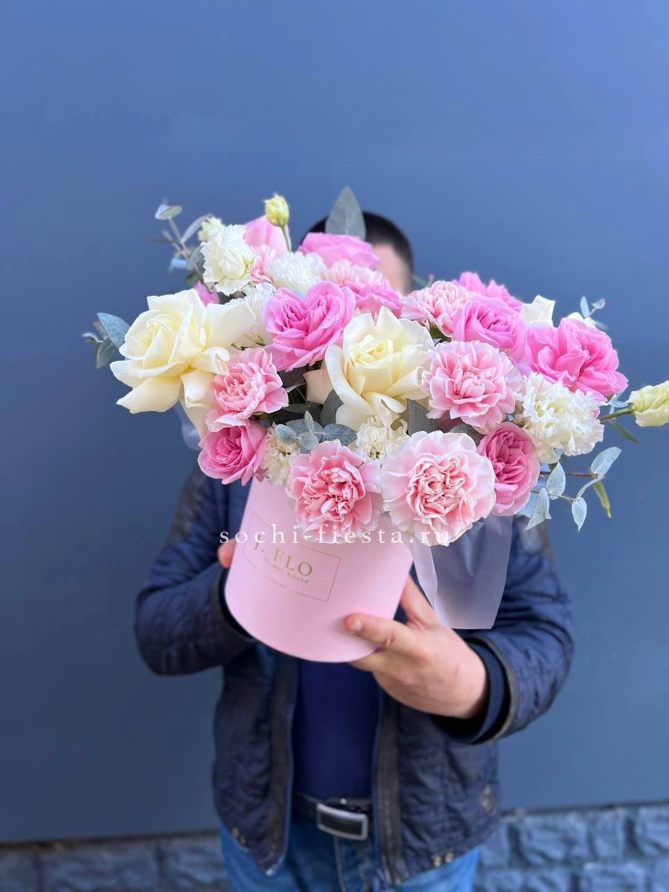 Состав: белые розы, розовые розы, эустома, диантус эвкалипт, цилиндр D16.