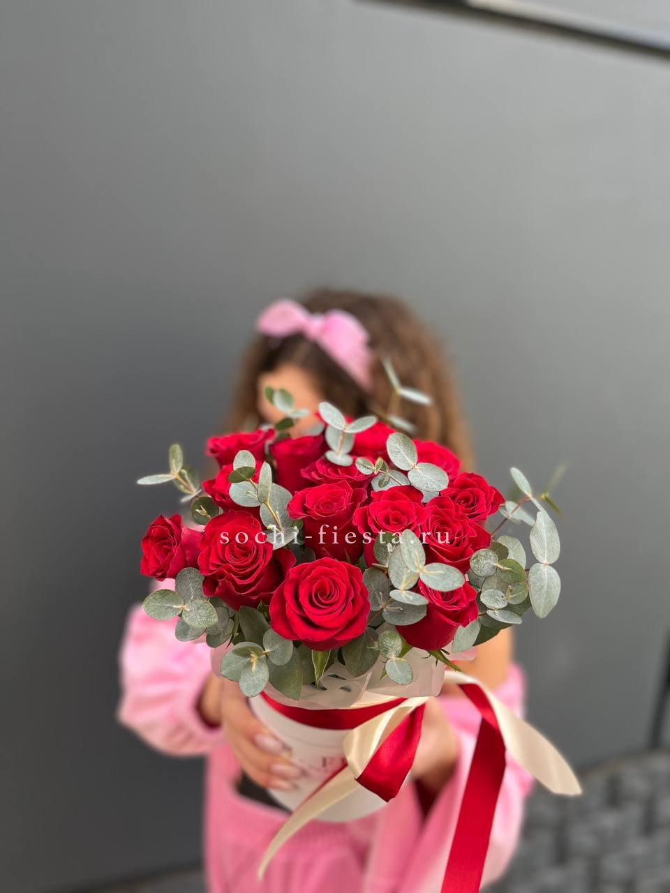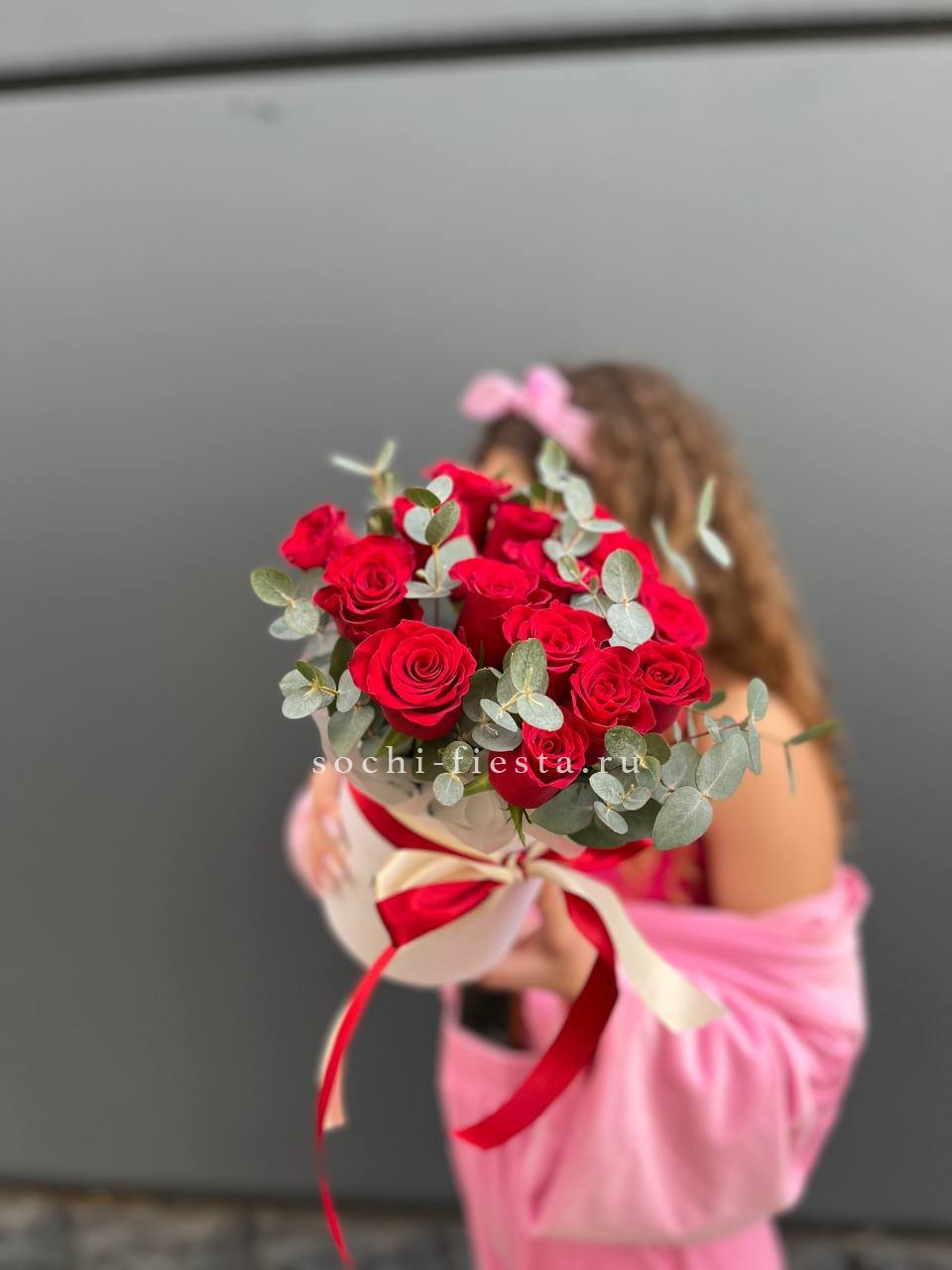 Состав: роза, диантус, пионы или гортензия, розы, бомбастик, эустома, декоративная зелень, цилиндр D16
