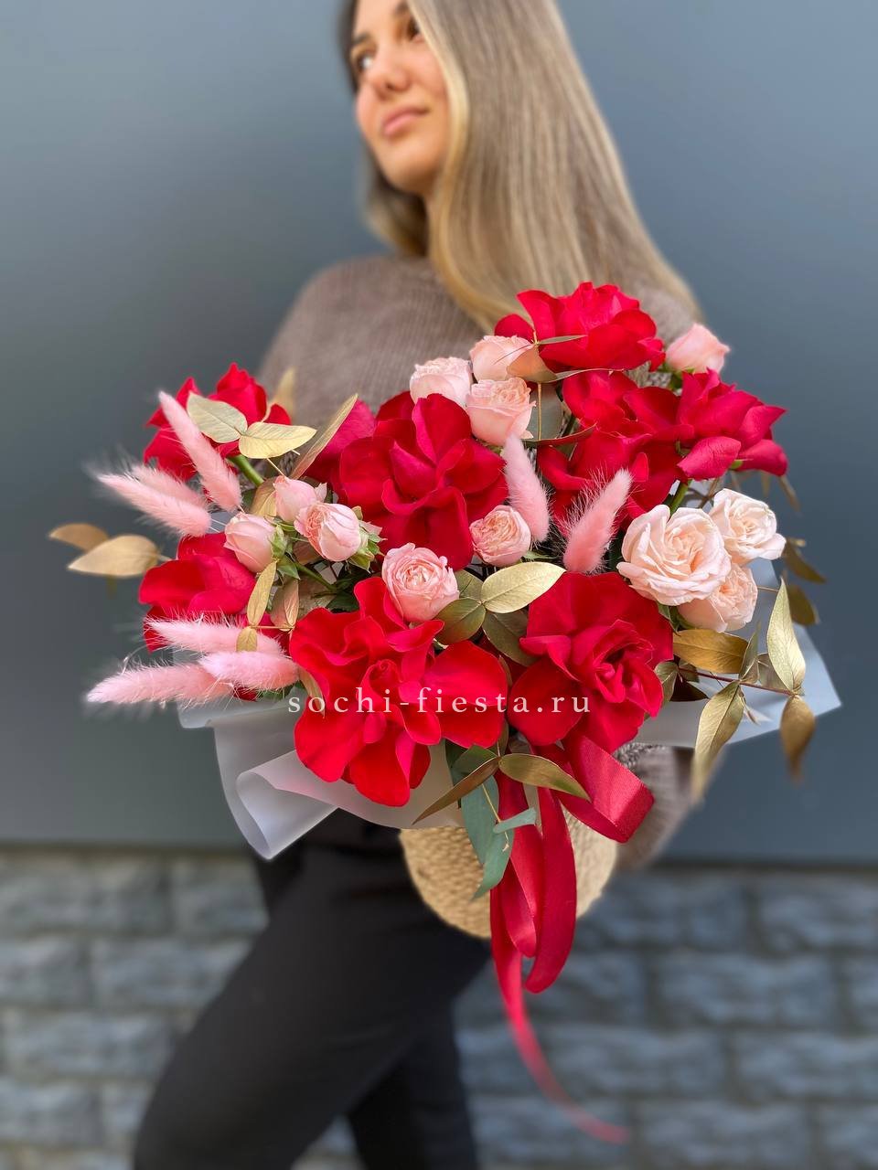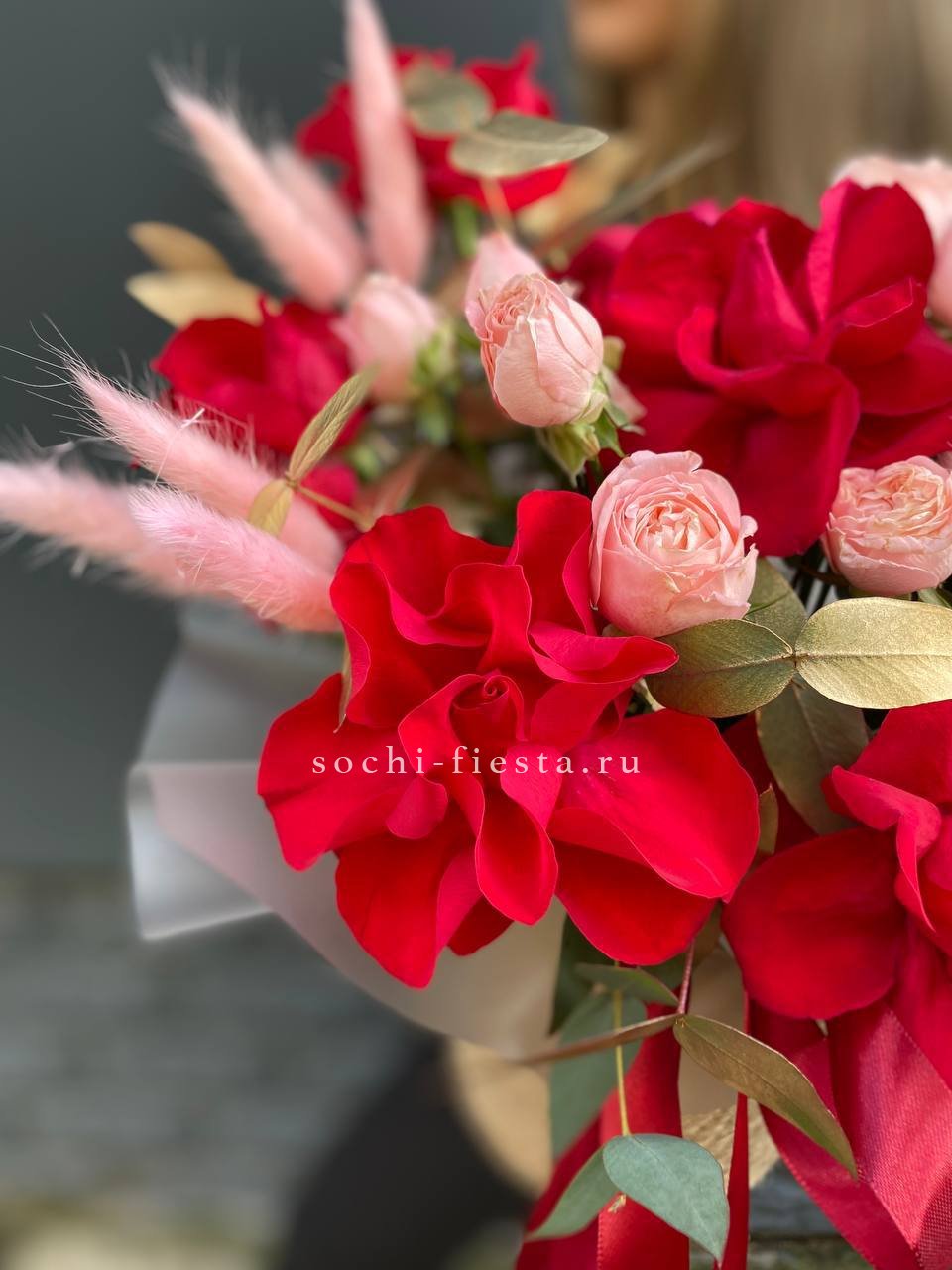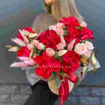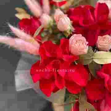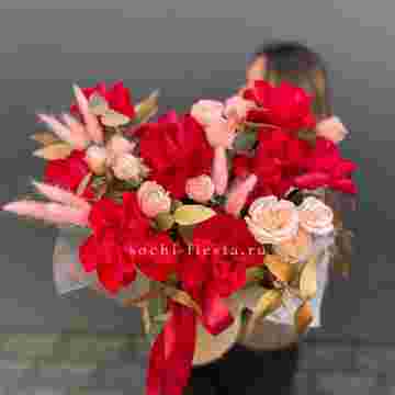 Состав: красная роза, бомбастик, лагурус, золотой эвкалипт, джутовое кашпо