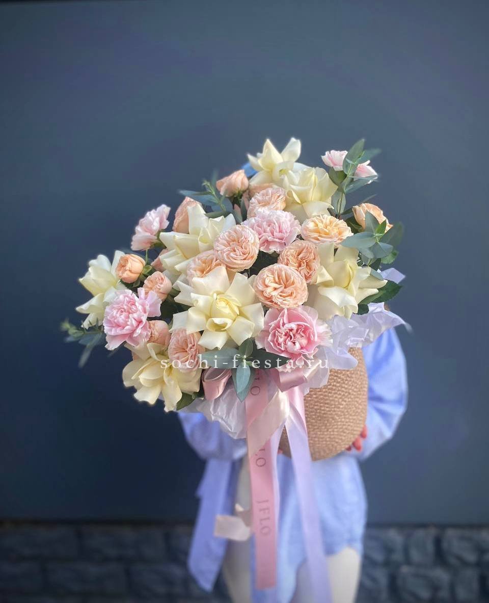 Состав: белые и кустовые розы, диантус в джутовом кашпо с эвкалиптом