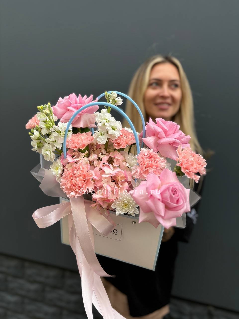 Состав: сумочка в нежных тонах из диантусов, роз, гортензий, маттиолы, хризантемы