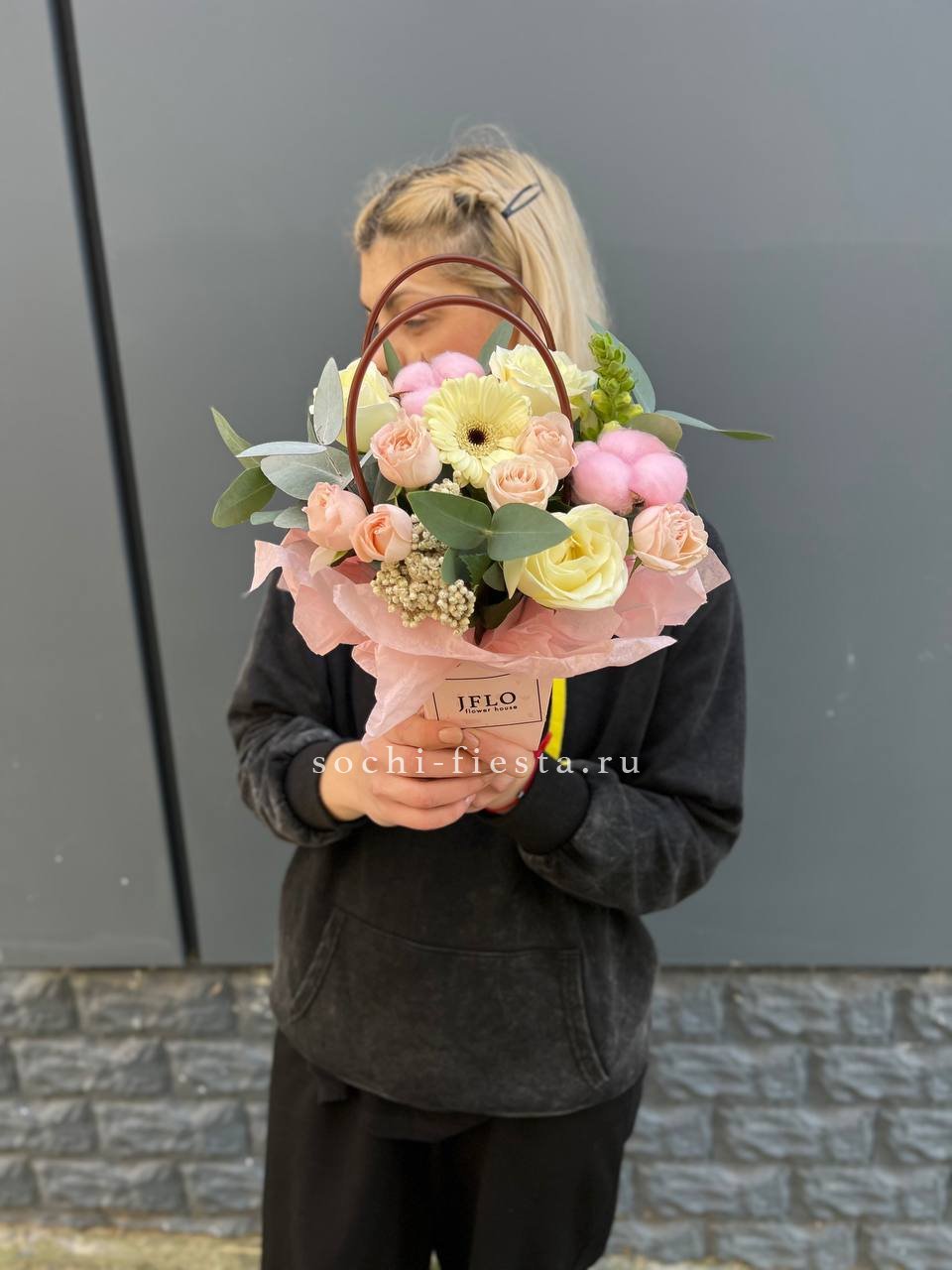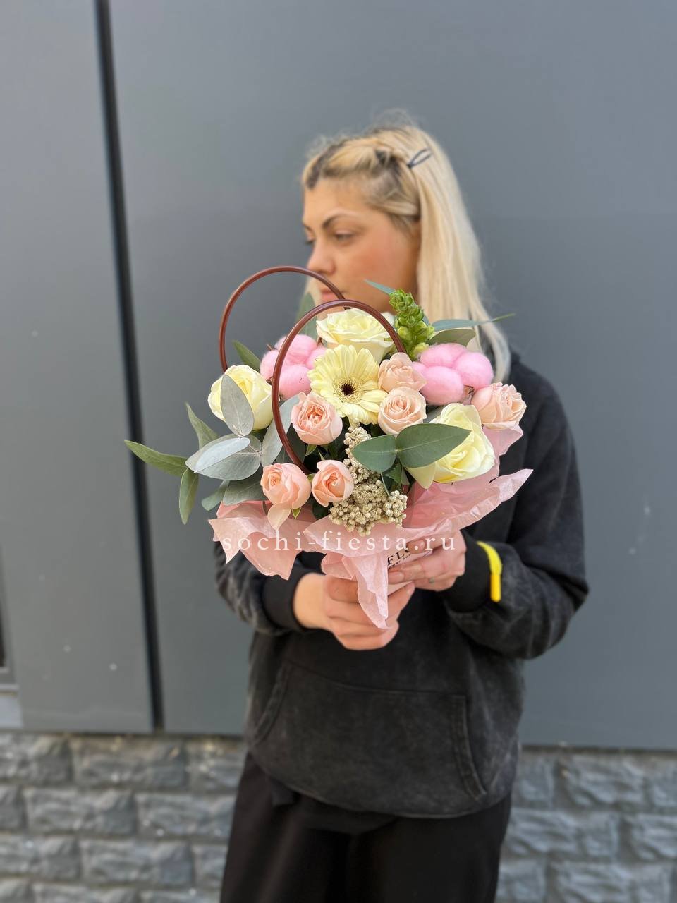 Состав: эустома, гербера, бомбастик, хлопок, эвкалипт, озатамус, розы, сумочка
