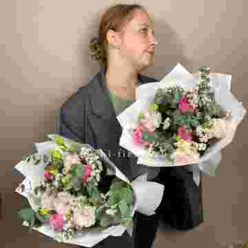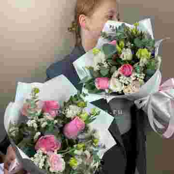 Состав: статица, роза, эустома, эвкалипт, пленка, лента