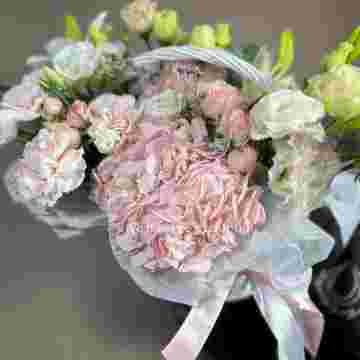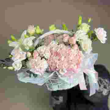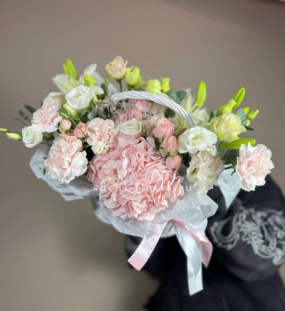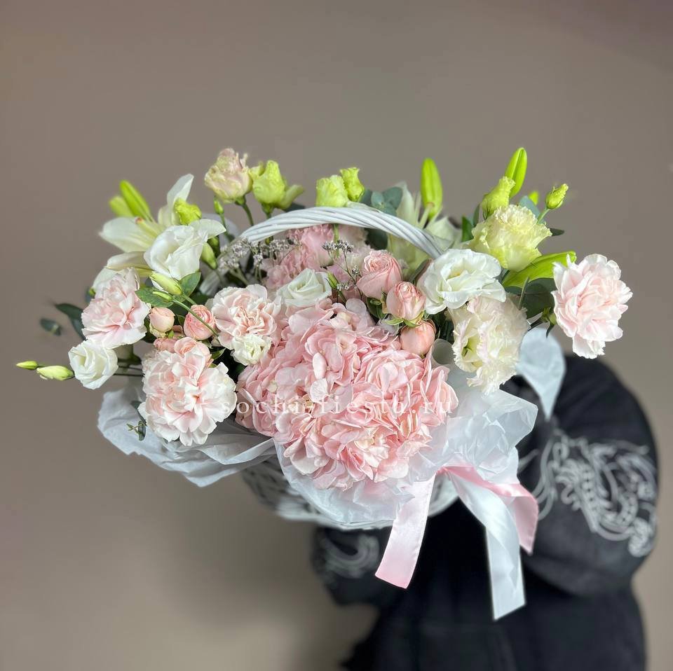 Состав: гортензия. бомбастик, диантус, лимониум, лилия, эустома. эвкалипт, корзина малая