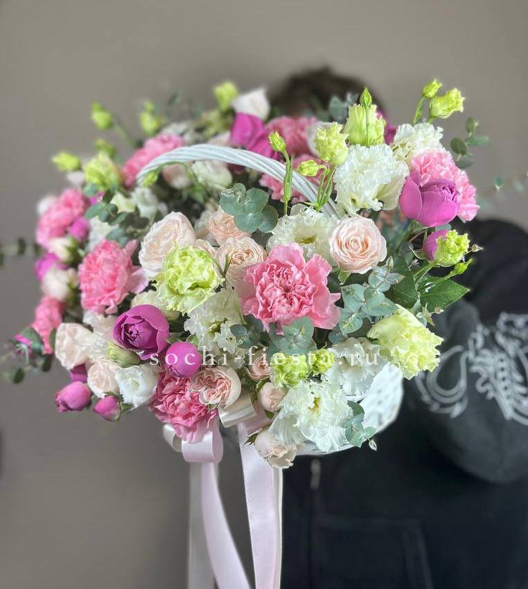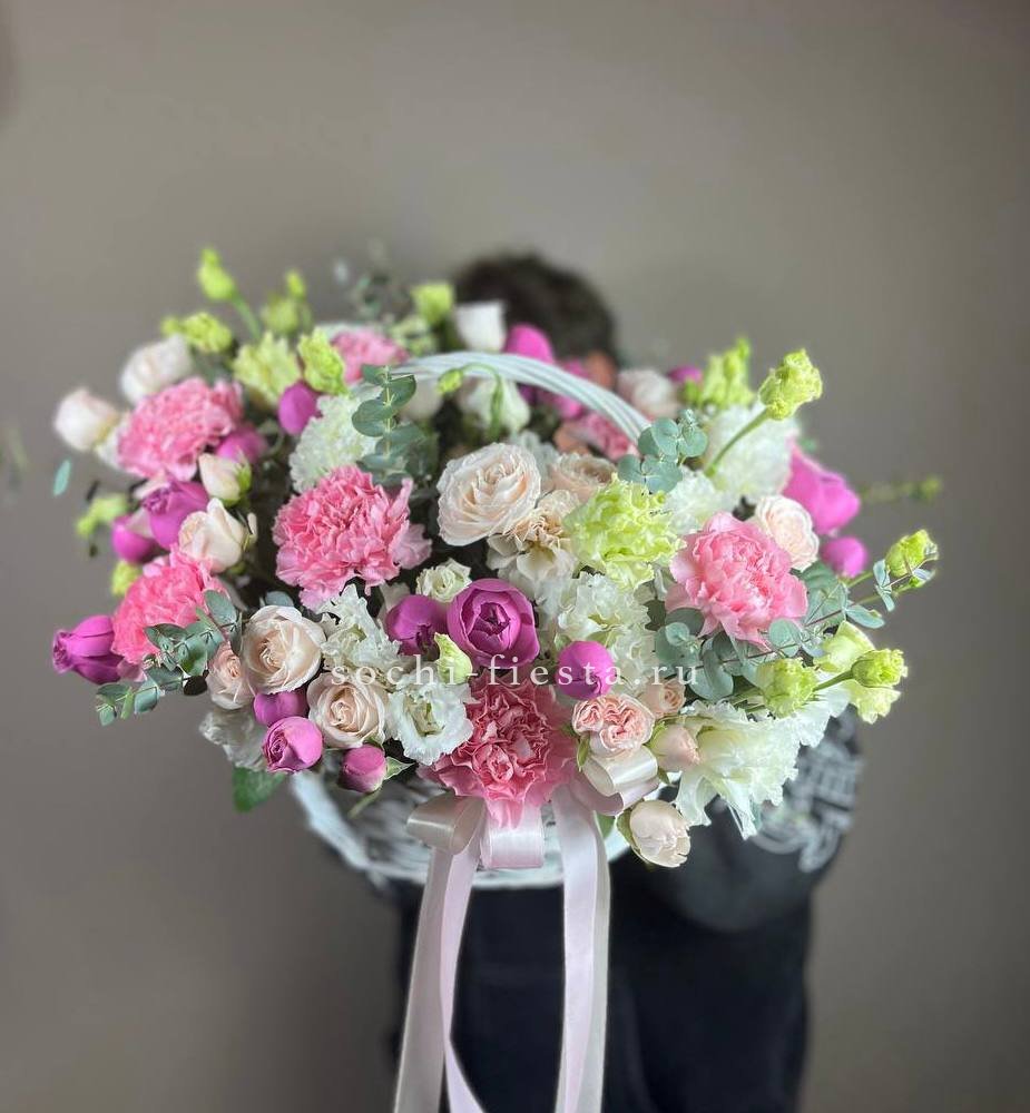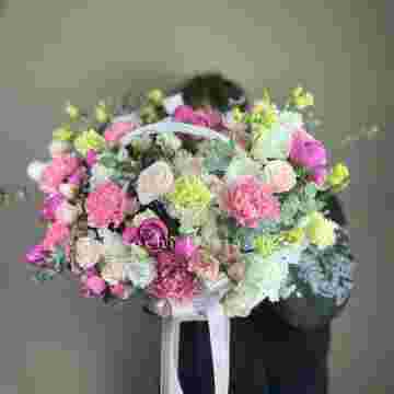 Состав: мисти баблс, бомбастик, эустома, диантус, эвкалипт, корзина маленькая