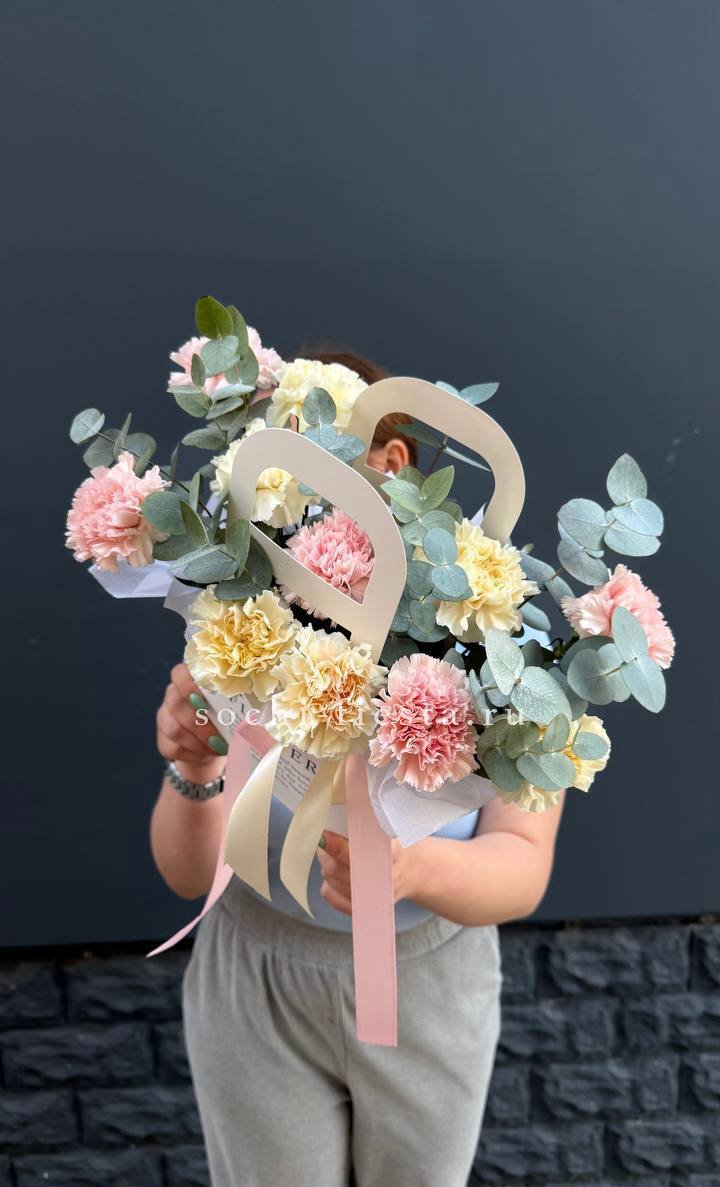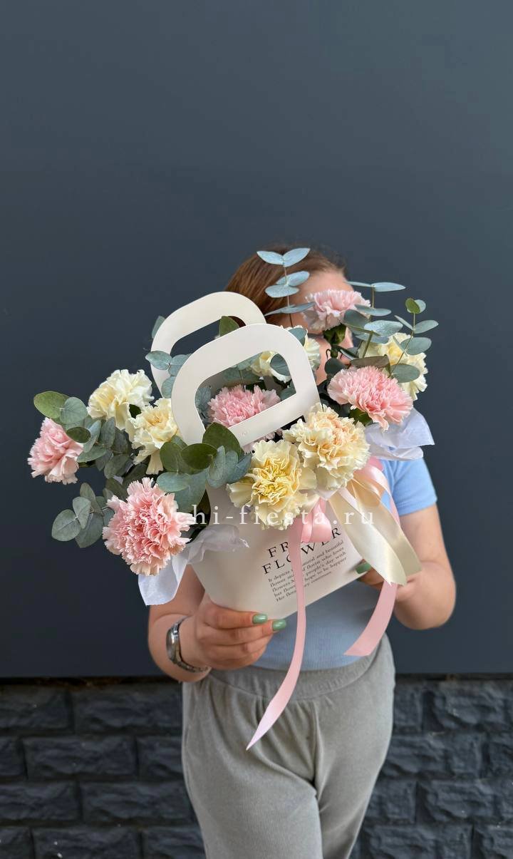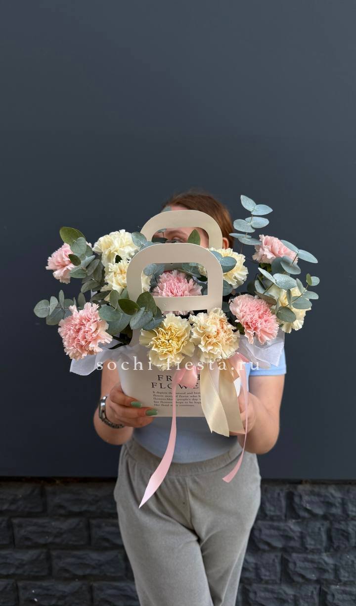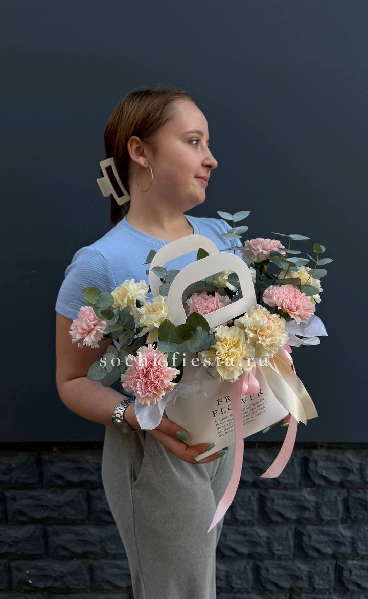Состав: сумочка из нежных диантусов с эвкалиптом