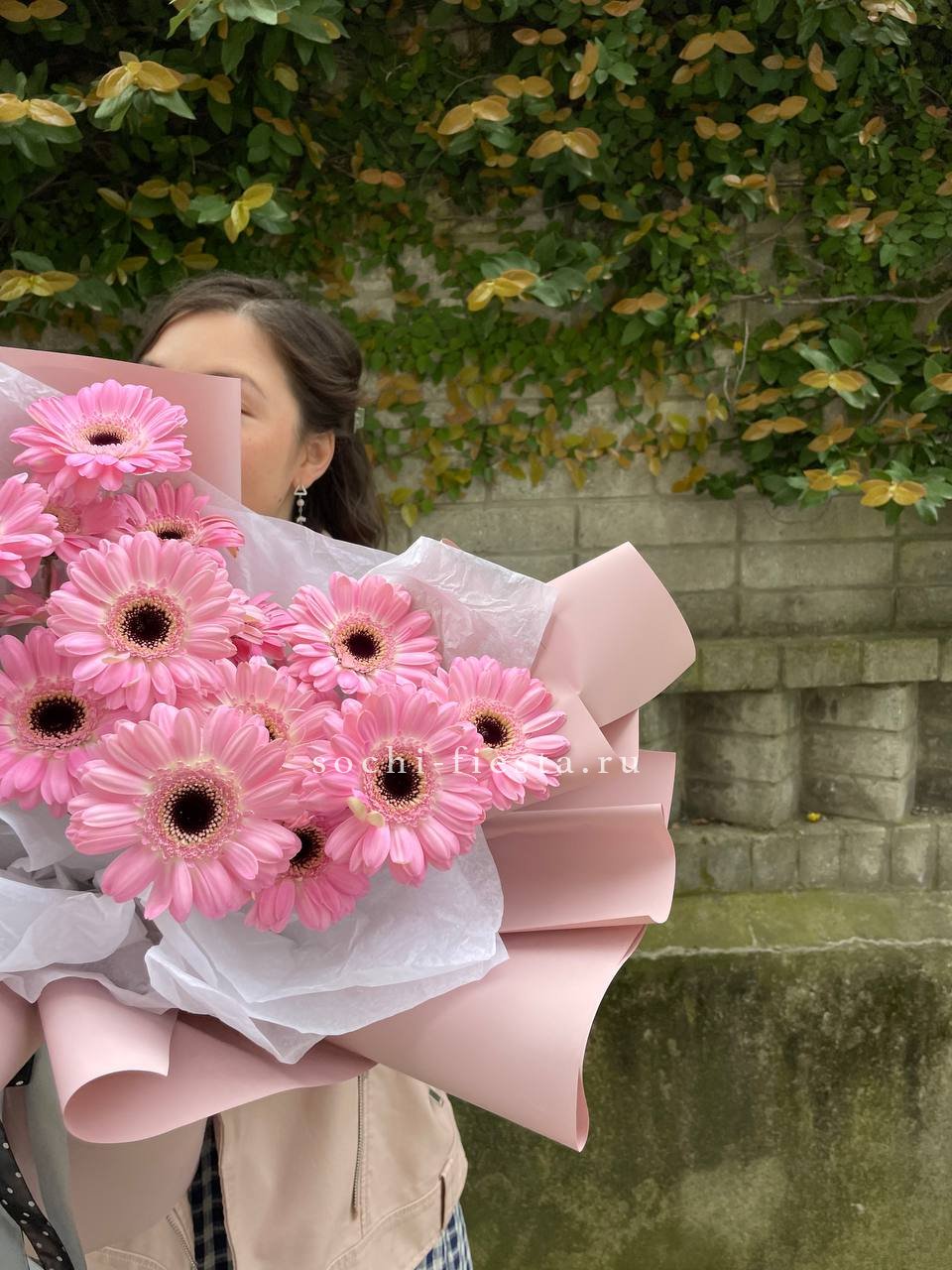 Розовые герберы отличаются похожими на маргаритки или подсолнухи соцветиями с длинными, бархатистыми лепестками, которые расходятся от центральной сердцевины. Оттенок может варьироваться от очень нежного, бледного розового до насыщенного ярко-розового цвета. Цветы обычно располагаются на длинных прочных стеблях без листьев.