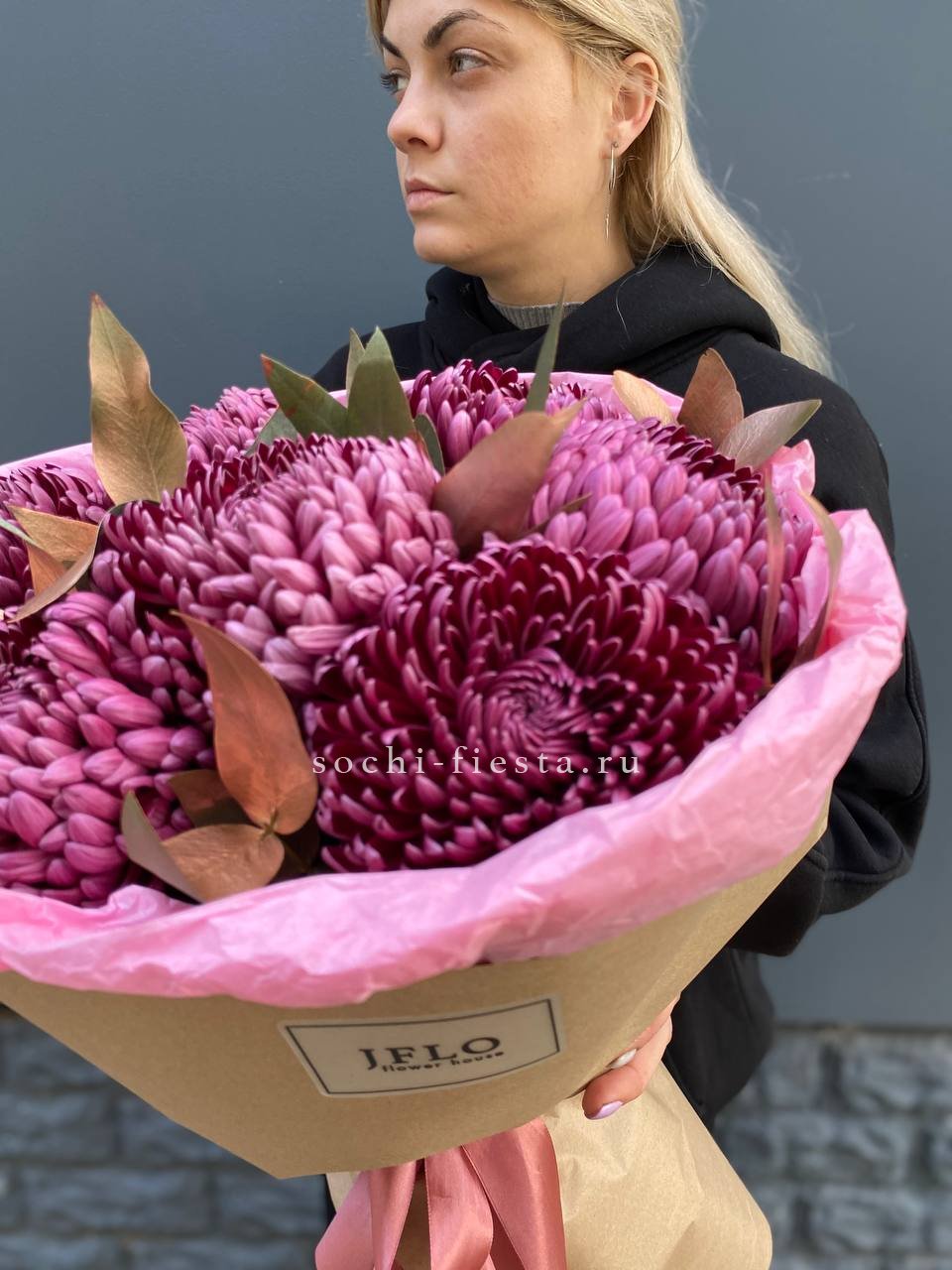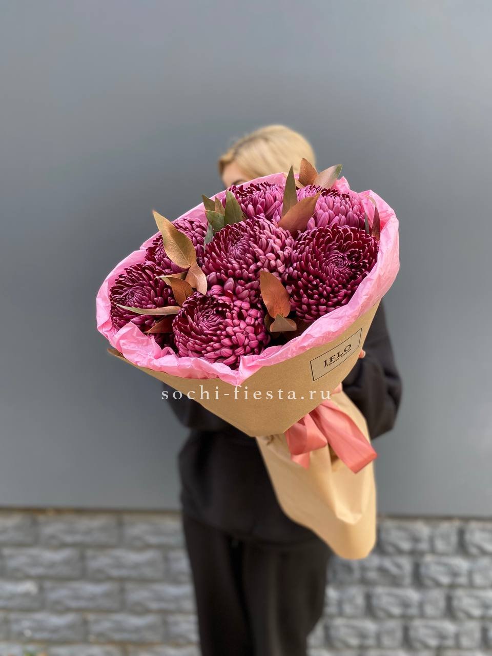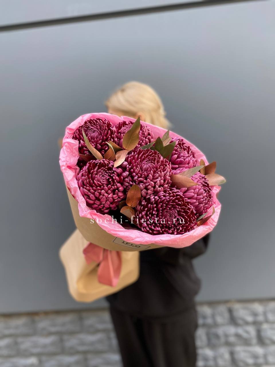 Состав: хризантема бигуди с золотым эвкалиптом в оформлении.