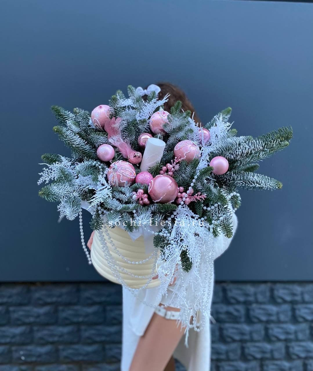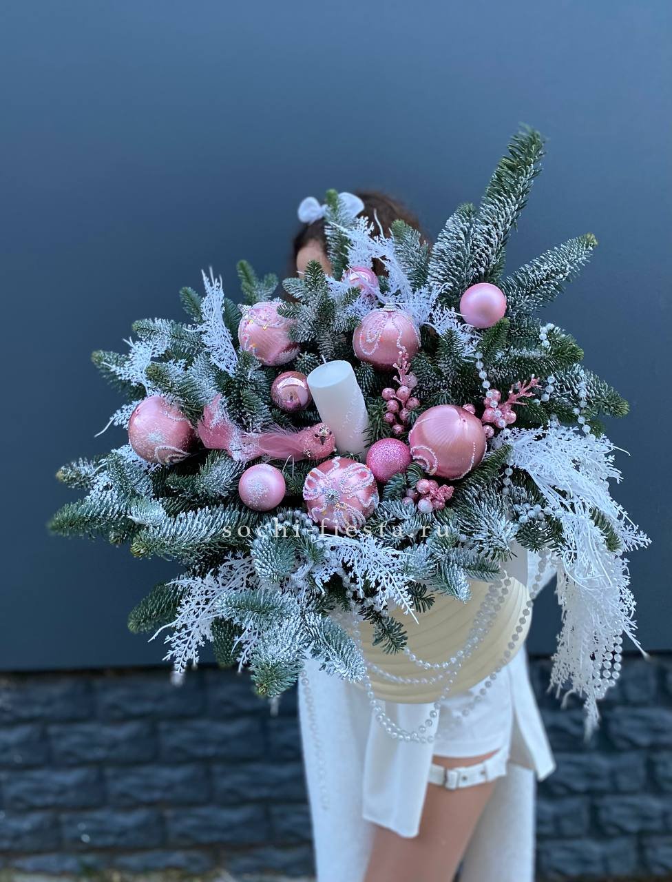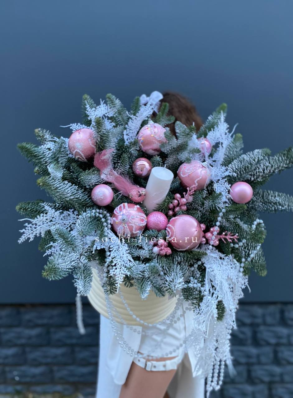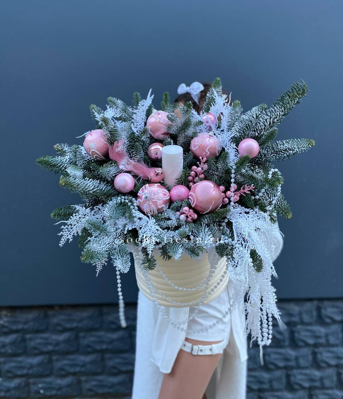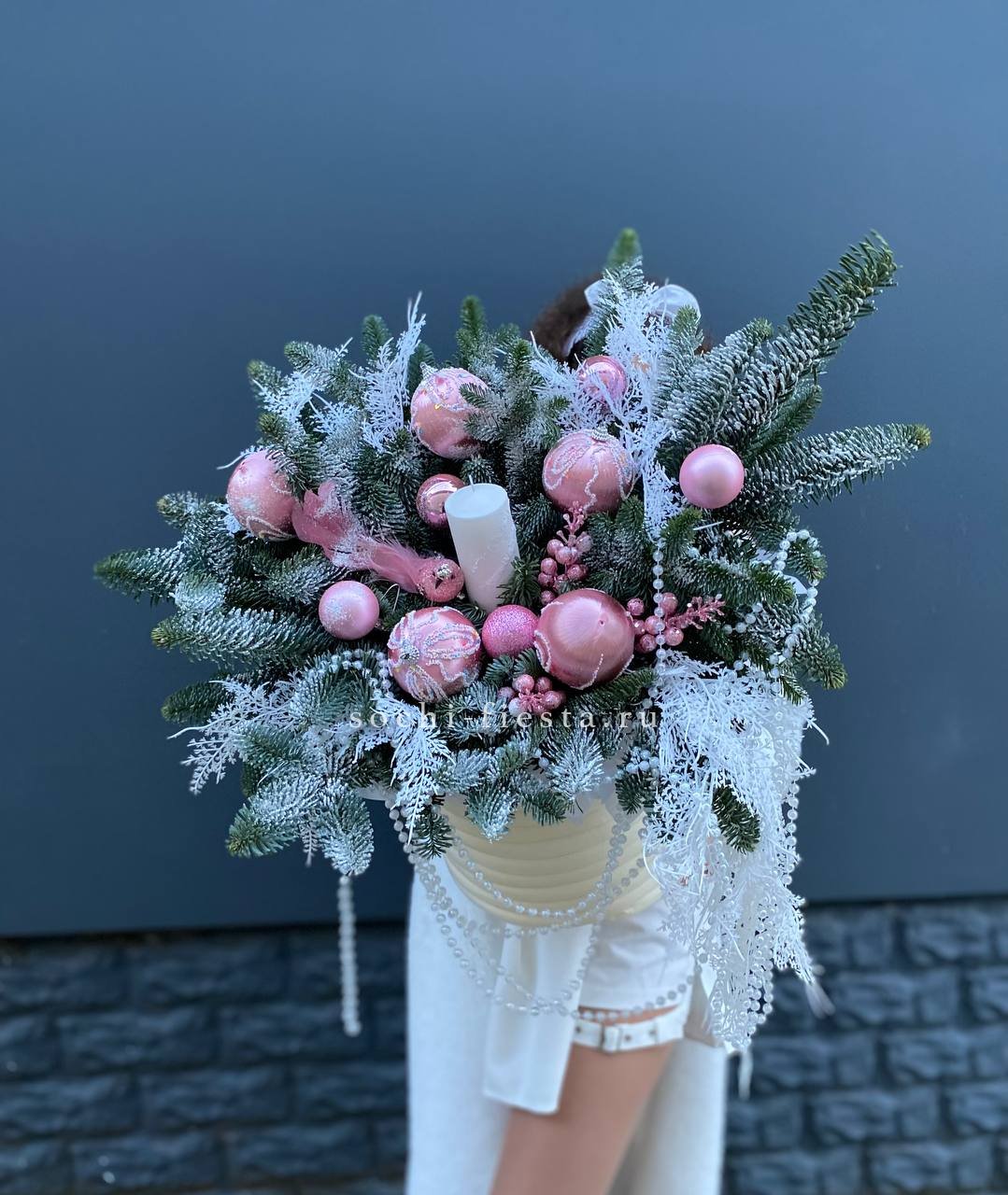 Состав: нобилис, цилиндр, оазис, свечи, новогодние игрушки, декор