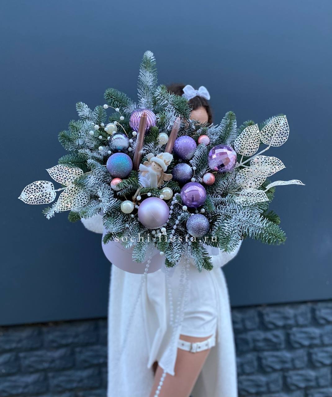 Состав: нобилис, цилиндр, оазис, свечи, новогодние игрушки, декор
