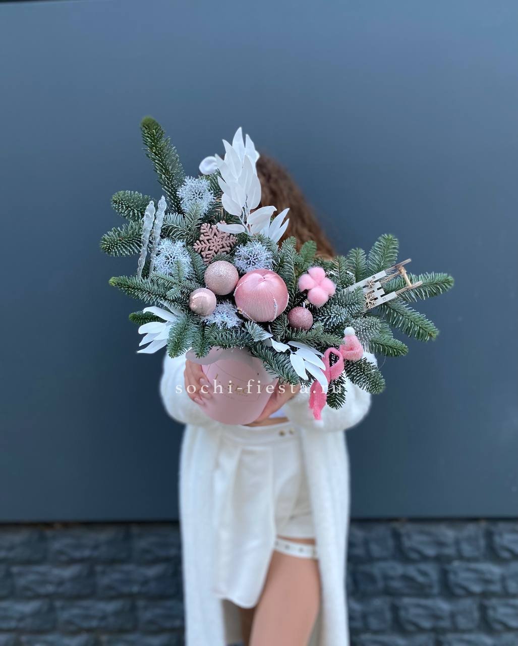Состав: нобилис, цилиндр, оазис, сани, новогодние игрушки, декор