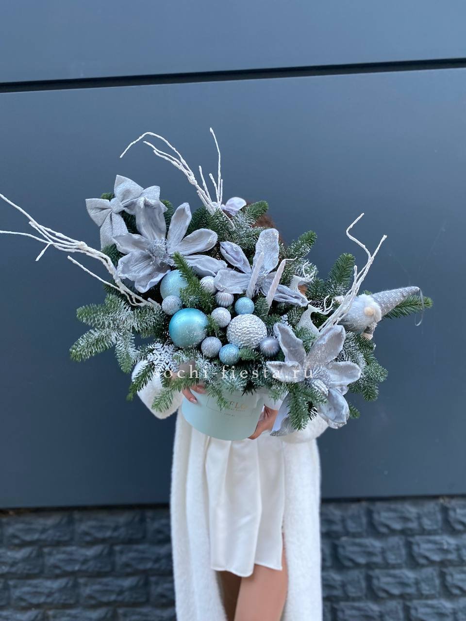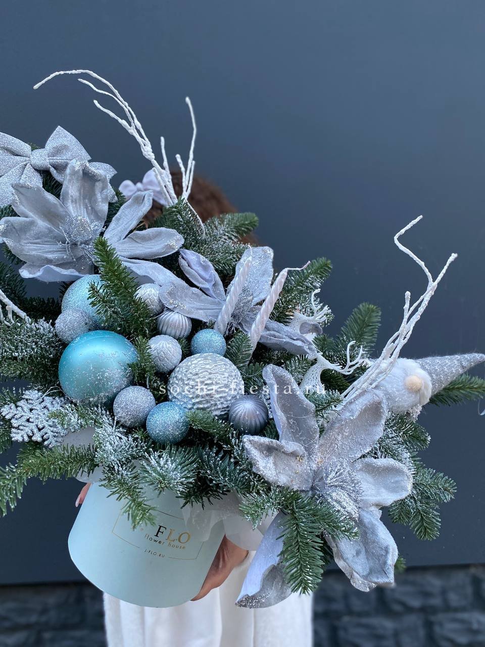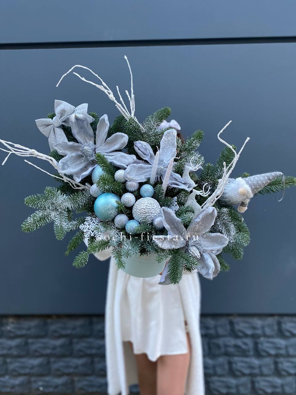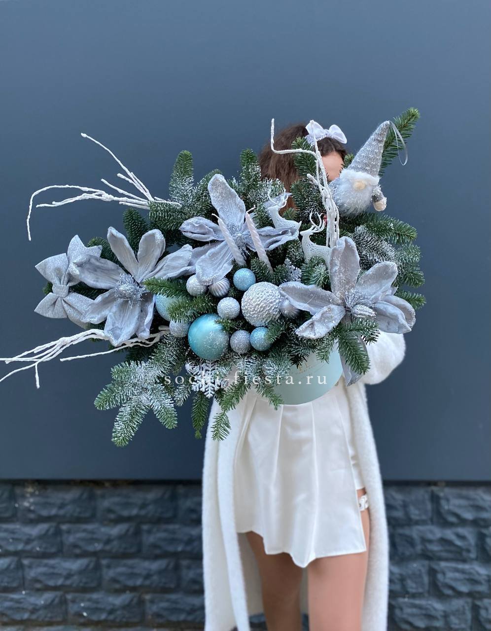 Состав: нобилис, цилиндр, оазис, свечи, новогодние игрушки, декор