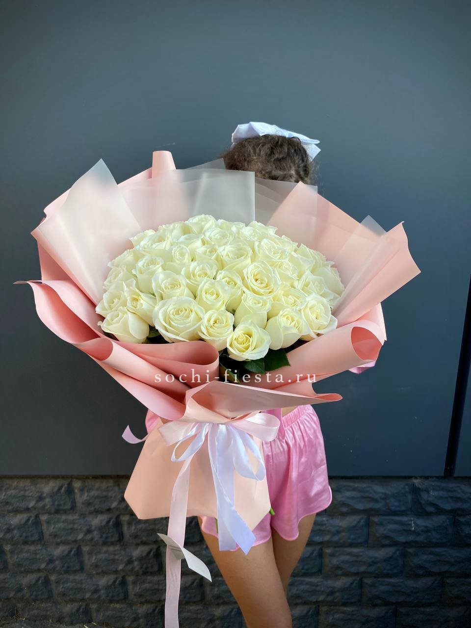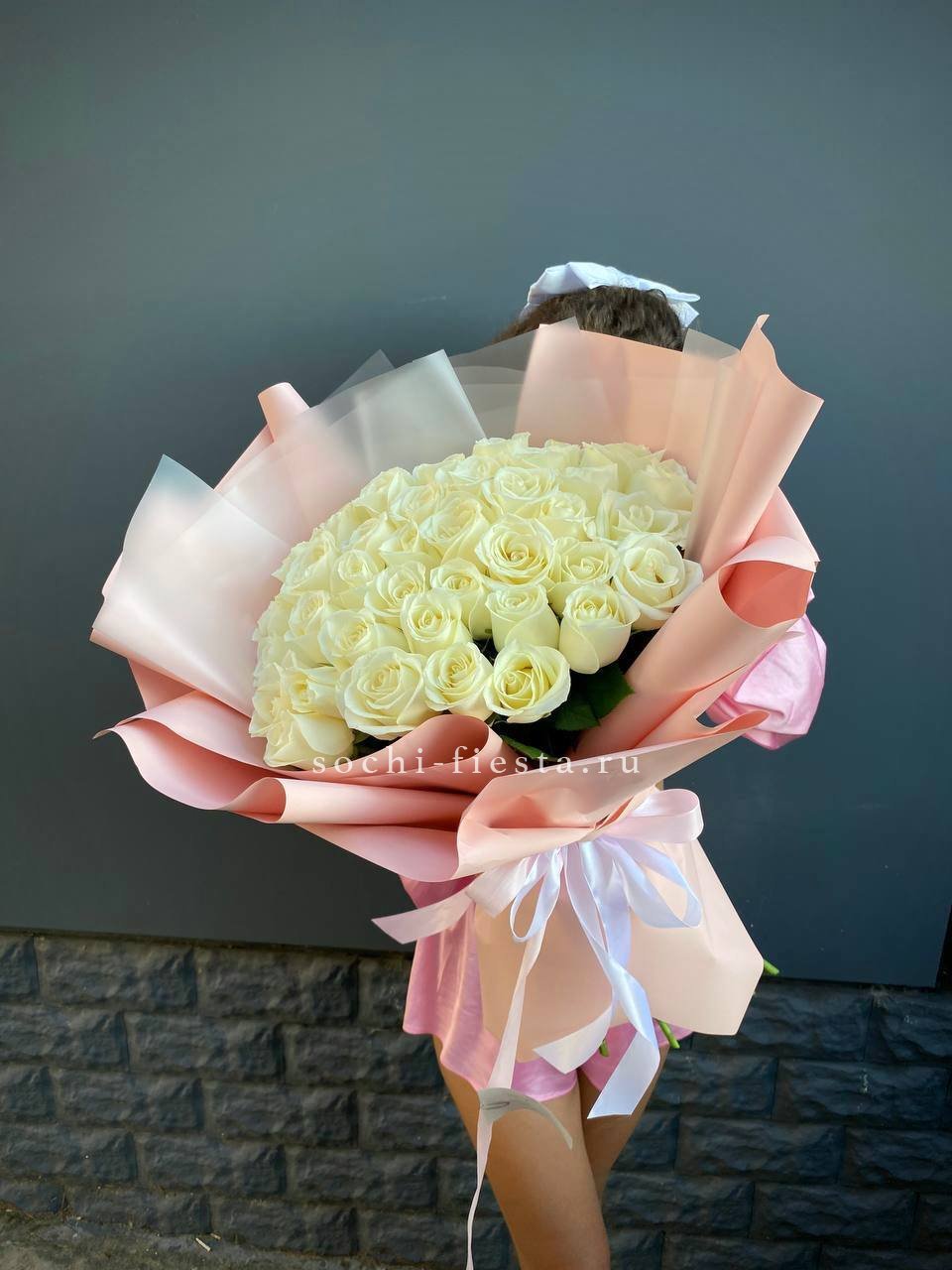 Состав: роза розовая - 101 шт., лента, белая дизайнерская бумага