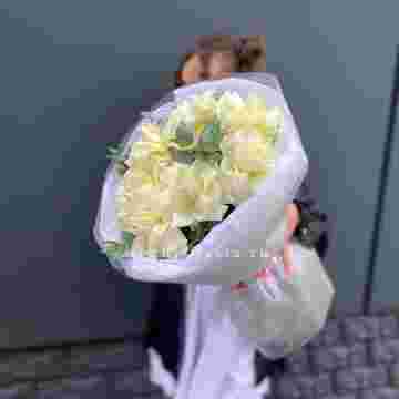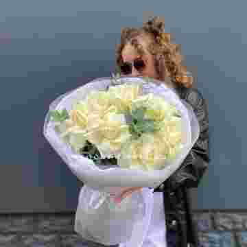 Состав букета на фотографии: вывернутые розы - 5 шт., эвкалипт - 2шт., лента, авторская упаковка