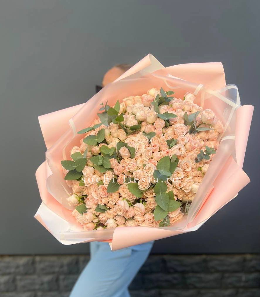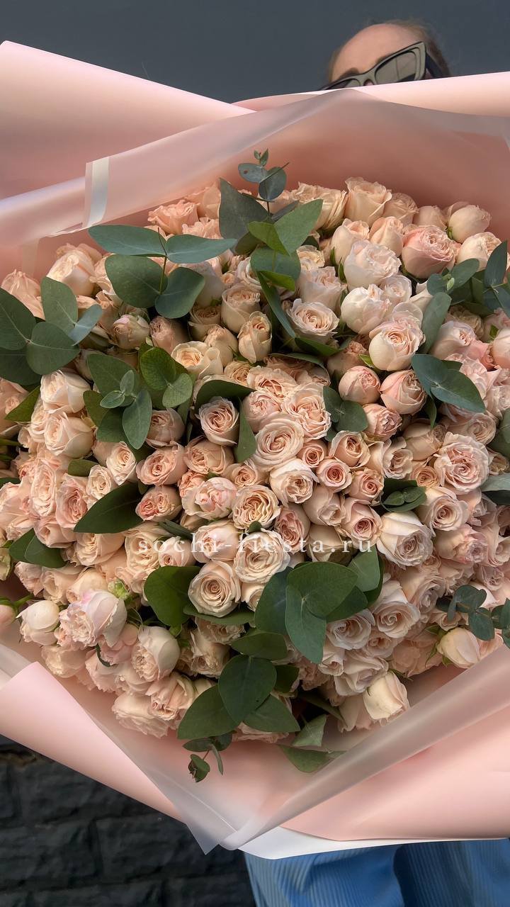 Состав: 101 кремовая кустовая роза, эвкалипт, лента, дизайнерская упаковка