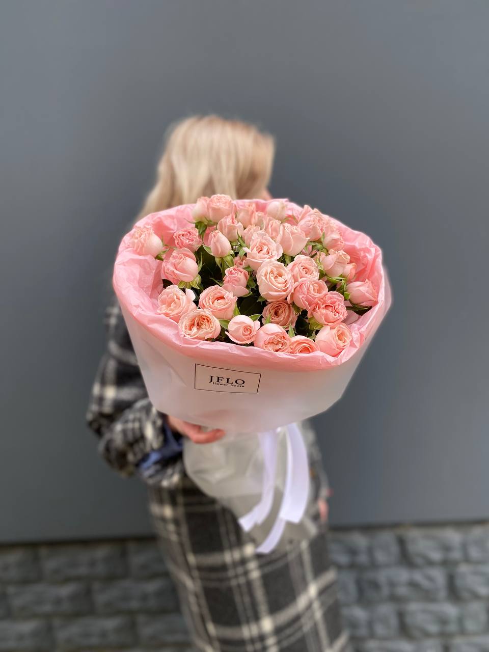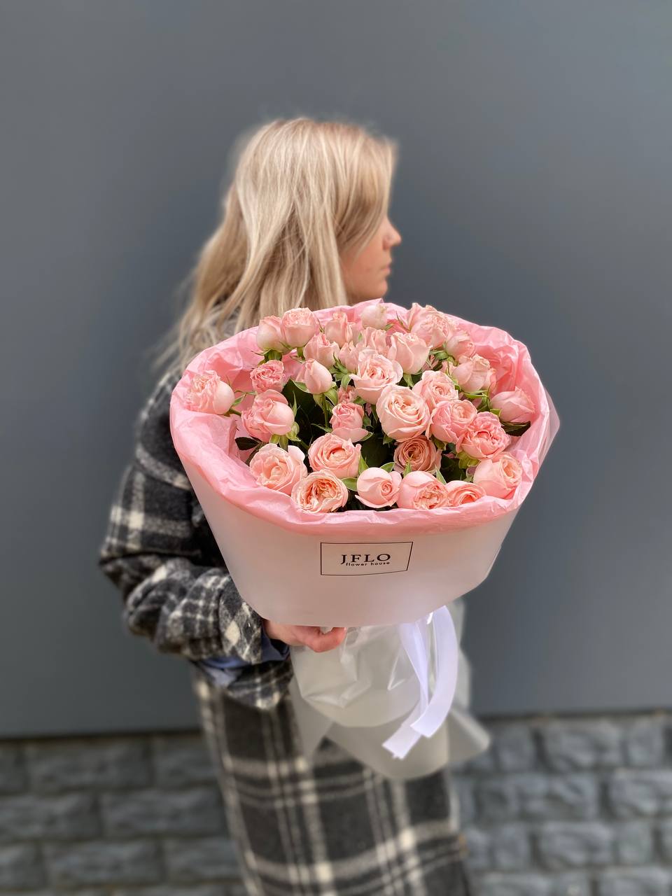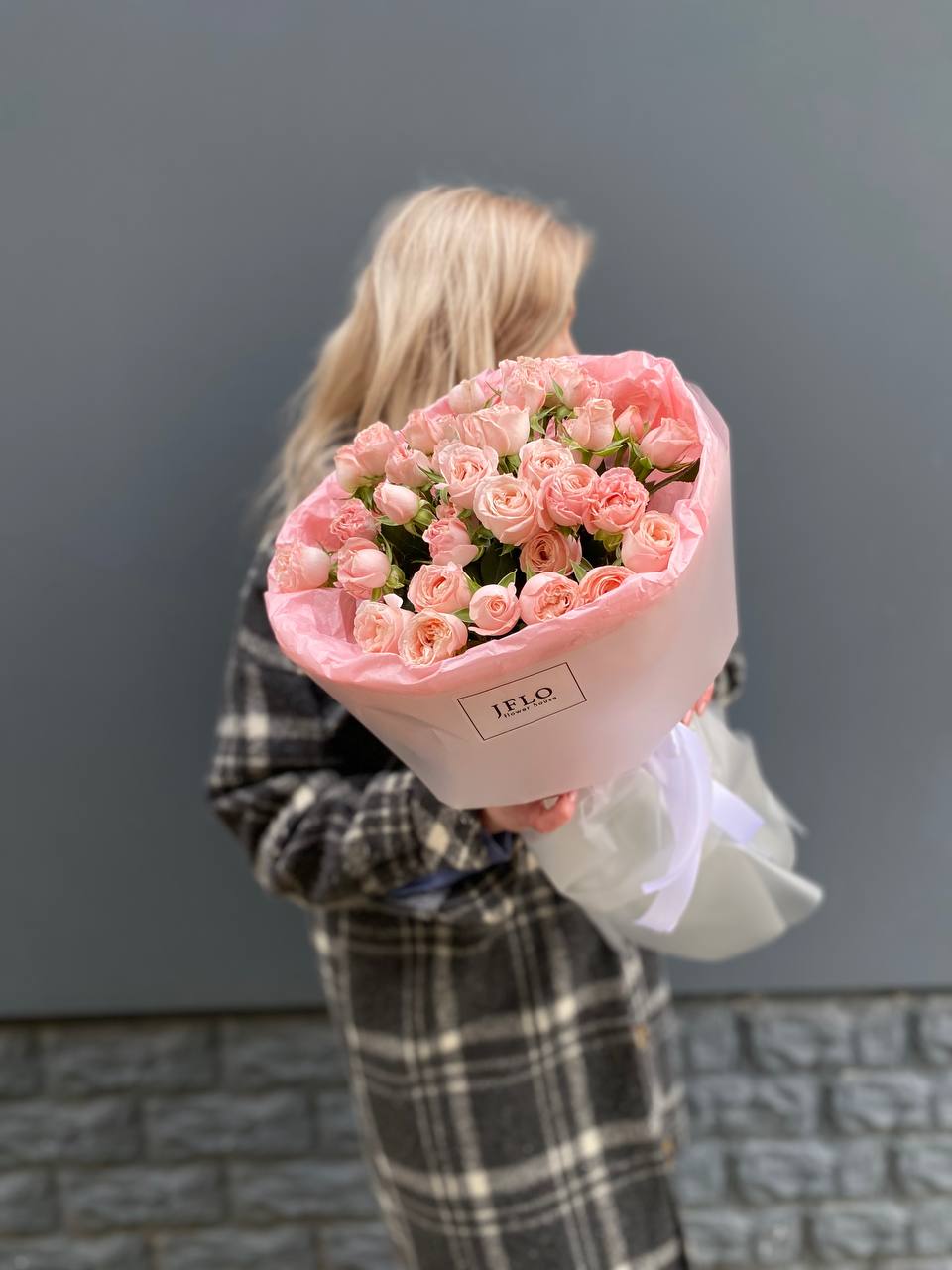 Одиннадцать кустовых роз с густыми многолепестковыми бутонами в нежно-розовой гамме. Каждая ветка раскрывается несколькими головками, создавая пышную объемную форму. Для тех, кто любит выразительные букеты с характером.
