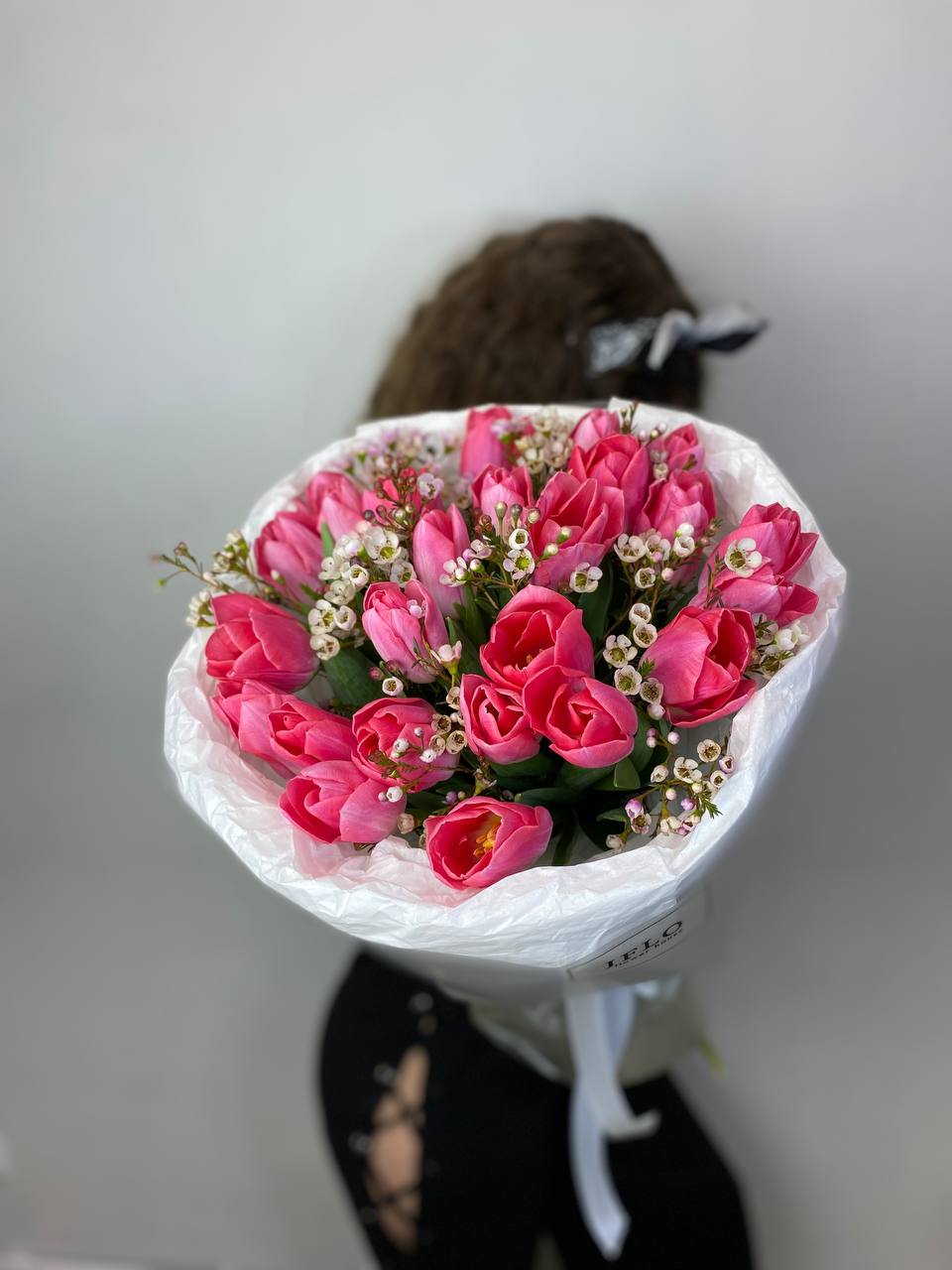 Два оттенка розового переплетаются в лаконичном весеннем дуэте. Тюльпаны с их гладкими бутонами дополнены воздушными соцветиями хамелациума.